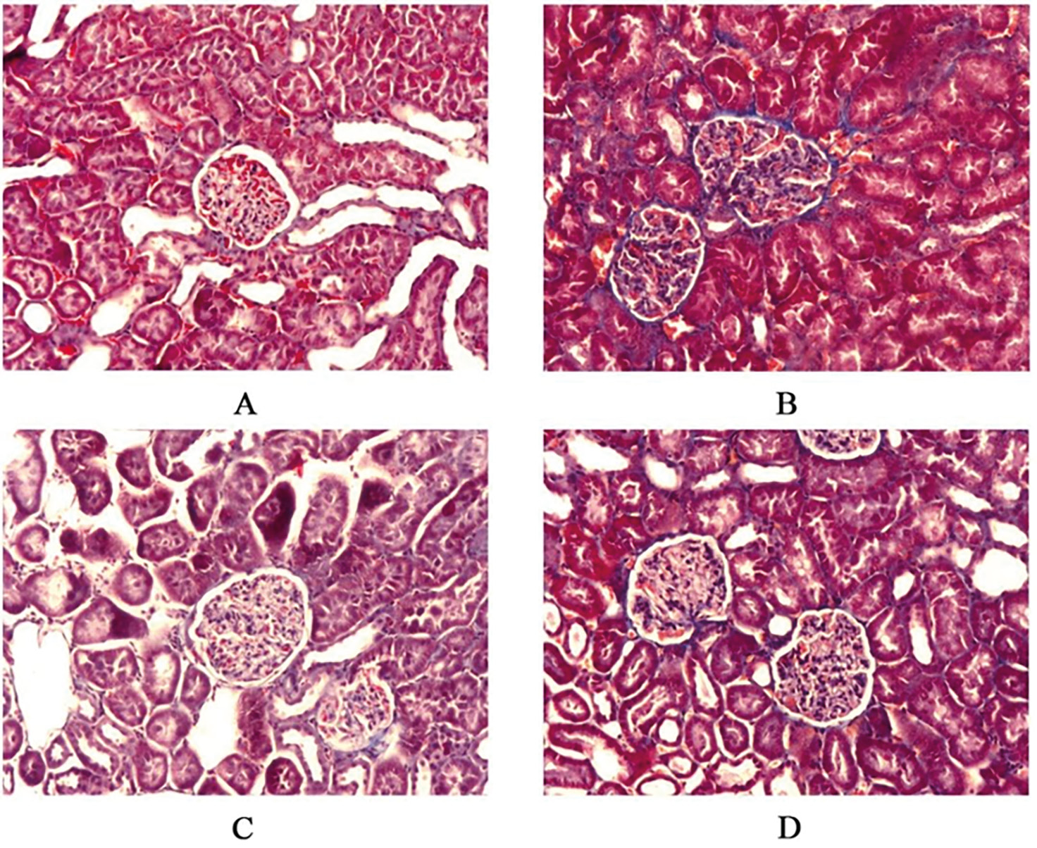 По окончании эксперимента животных декапитировали (предварительно наркотизировав хлоралгидратом, 400 мг/кг внутрибрюшинно). Почки удаляли, образцы коркового и мозгового вещества почек фиксировали в течение 24 ч в 10% (масса/объем) нейтральном забуференном формалине и заливали в парафин. Срезы толщиной 3–5 мкм окрашивали трихромом по Массону для оценки гломерулосклеротических изменений и отложений соединительной ткани. Другие фиксированные формалином срезы почек помещали на предметные стекла и окрашивали с применением кроличьих поликлональных антител к КПГ в соответствии с инструкциями производителя. После протекания иммунологической реакции ткани окрашивали гематоксилином. Визуализация выполнялась с помощью микроскопа Axiostar Plus (Carl Zeiss Microscopy GmbH, Германия) и цифровой камеры Axiocam 105 Color (Carl Zeiss Microscopy GmbH, Германия). Изображения анализировали с помощью программного обеспечения Zeiss Zen Pro 2012 (Carl Zeiss Microscopy GmbH, Германия). Результаты выражали как процент площади с положительным окрашиванием.