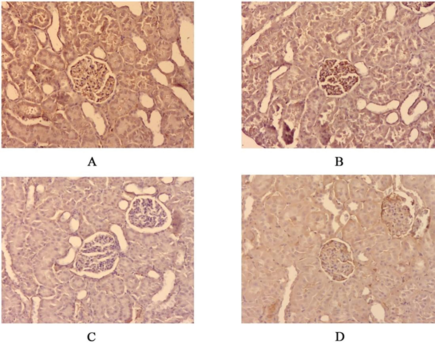 Примечание: Иммуногистохимическое окрашивание КПГ в почках: (A) контроль без диабета, (B) животные с диабетом без лечения, (C) диабет + соединение ALT-711 и (D) диабет + соединение ДФ-5. Увеличение ×100