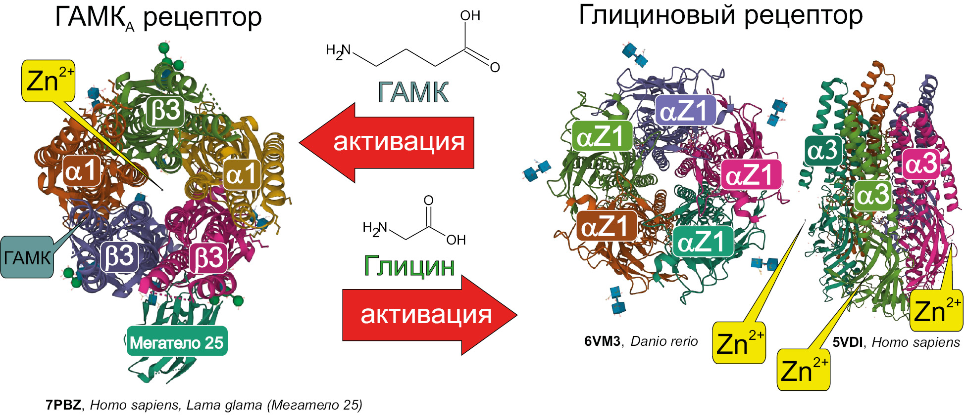 Treatment regimens for anxiety states of various origins are based on the use of a number of anxiolytic psychotropic drugs [3]. The molecular mechanism of their anti-anxiety action is based on a long-term increase in the activity of subclass A gamma-aminobutyric acid (GABA) receptors [4]. This class of membrane receptors responsible for the inhibition in neurons belongs to the family of pentameric ligand-gated ion channels (pLGICs) [5, 6]. The interaction of the agonist with the receptor, leading to the opening of a selective anion channel on the surface of the excitable membrane, leads to an increase in the Cl- flux, which causes hyperpolarization of the neuron [7]. This activation of the transmembrane anionic current through the GABA receptors makes it possible to consider GABA as the main inhibitory neurotransmitter in the central nervous system (CNS) in the classical approach to neurophysiological processes [8]. Along with this, the second most physiologically important mediator that causes inhibition in the neurons of the spinal cord and brainstem is amino acid glycine [9]. This neurotransmitter, along with GABA, is present both in specific glycinergic and mixed synapses and is widely distributed in different parts of the brain. It also activates the transmembrane conductivity of chloride ions in the glycine receptor (GlyR), which belongs to the already mentioned pLGICs family [10, 11] (Fig. 1).