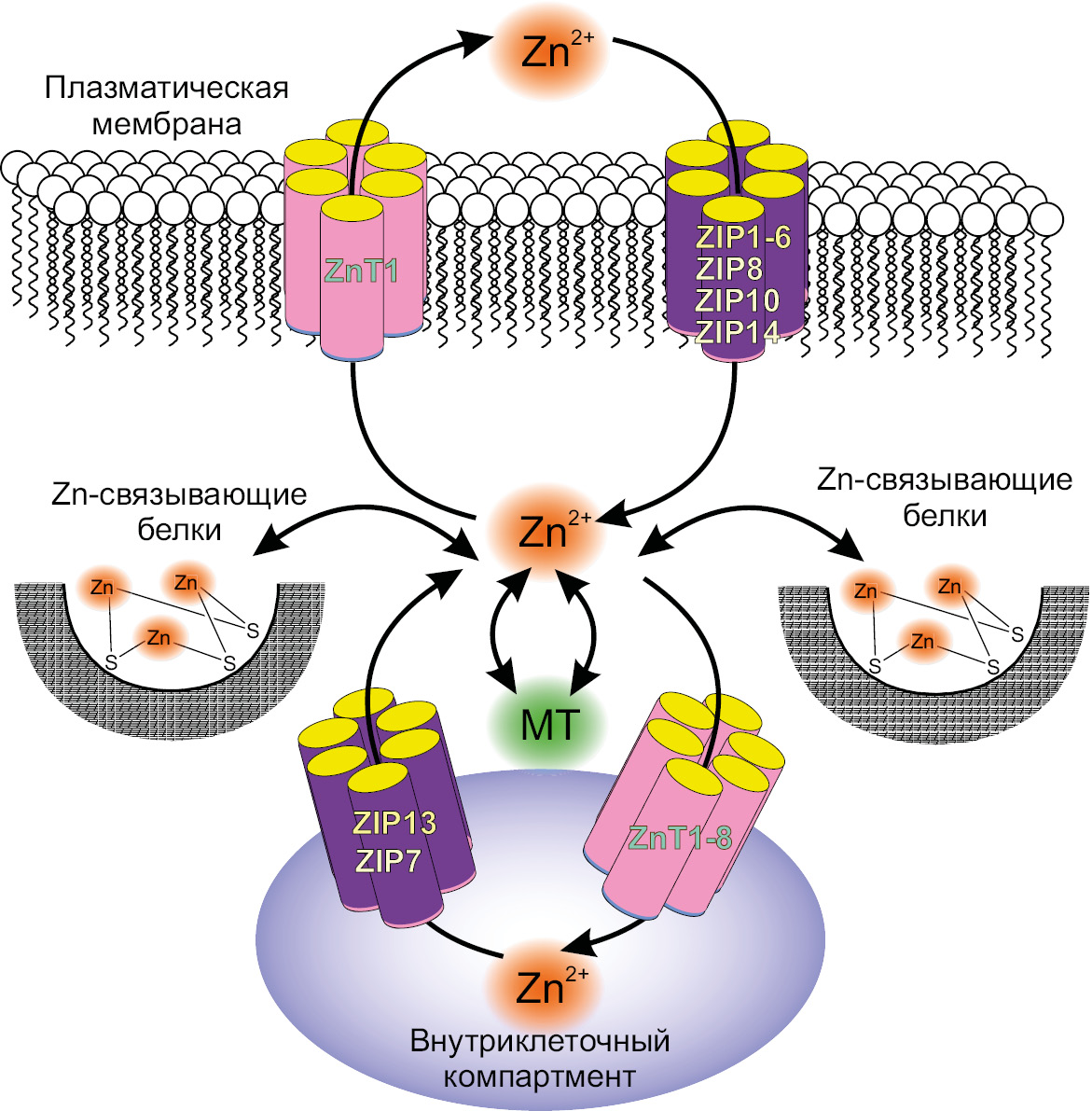 At the cellular level, 30–40% of zinc is localized in the nucleus, 50% in the cytoplasm and organelles, and the rest – in the cell membrane. Cellular zinc homeostasis is mediated by three main mechanisms [26]. First, this is transport across the plasma membrane by importer proteins from the ZIP and ZnT families (Fig. 2). Second, this is due to the sequestration mediated by the transporter into intracellular organelles, including endoplasmic reticulum, a Golgi complex and lysosomes. To maintain the cell viability, a strict control of zinc homeostasis is necessary, since dysregulation leads to the cell death. The third mechanism for maintaining homeostasis is the metallothionein/thionein system [18]. Metallothioneins (MTs) form complexes with about 20% of intracellular zinc. MTs are ubiquitous proteins characterized by a low molecular weight, a high cysteine content and the ability to form complexes with metal ions.