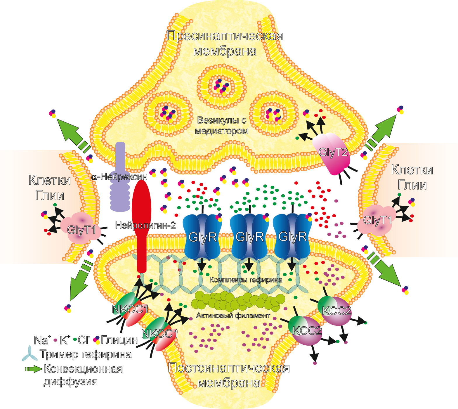 It should be emphasized that a distinctive structure feature of the postsynaptic region containing glycine and GABAA receptors is their cluster organization on the membrane surface. A similar effect is achieved due to the interaction of GlyR with a specific protein, gephyrin [44], which consists of three subunits [43] and forms trimers associated with cytoskeleton (Fig. 3). This protein is a part of a multistage system that ensures the formation and development of neuroplasticity of the neurons postsynaptic membrane containing receptors activated by inhibitory neurotransmitters (glycine and GABA) [45]. This process is dynamic and can be regulated in various ways, in particular, by the level of a specific brain-derived neurotrophic factor [46]. Glycine released into the synaptic cleft is subsequently captured back into neurons and glial cells through the already mentioned GlyT carriers, and some of the neurotransmitter molecules are carried away by convection diffusion into the interstitial fluid. This process is important for the formation of spatial heterogeneity in the distribution of glycine and the explanation of the molecular mechanisms of its effects in neurons [33].