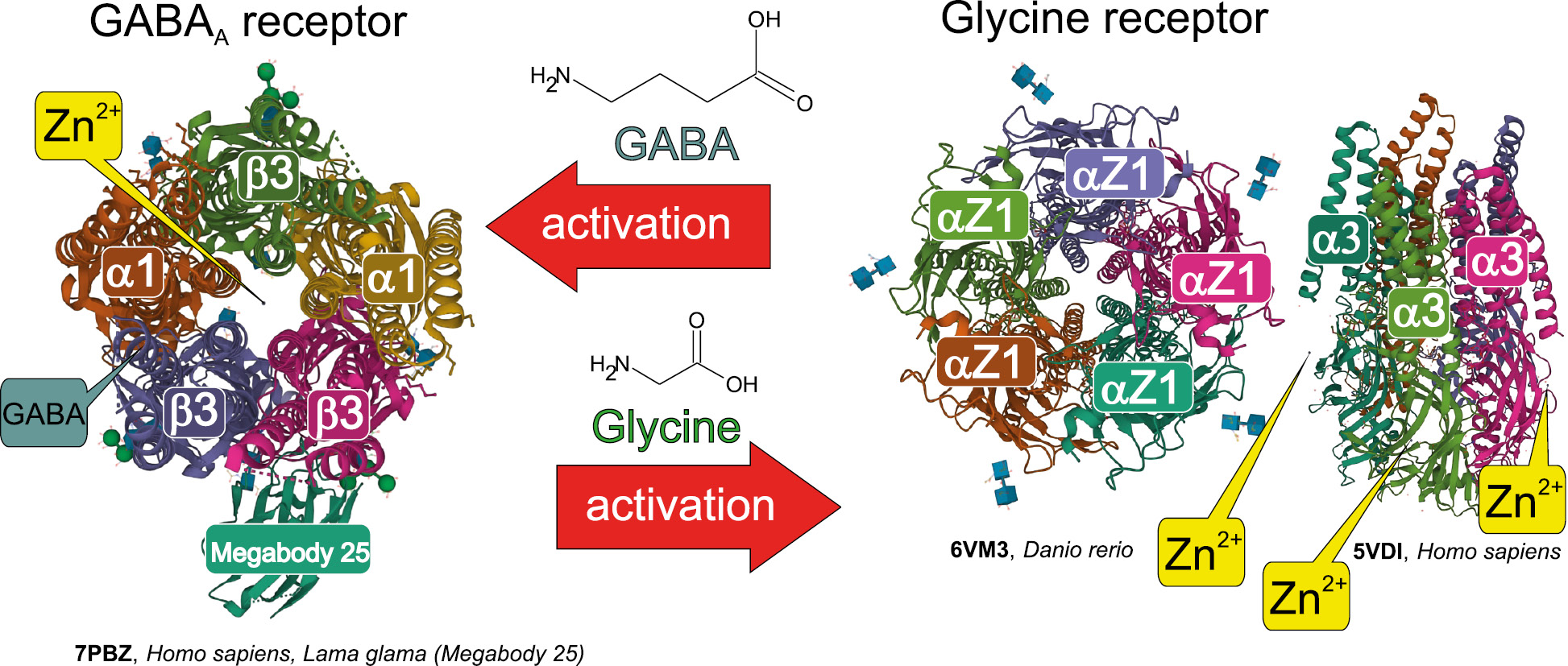 Figure 1 – Pentamers activation of pLGICs family by CNS inhibitory neurotransmitters. Note: Structural images of membrane proteins are presented based on the Protein Data Bank (PDB) (https://www.rcsb.org) in parallel planes (GABAA receptor, 7PBZ, [12]; glycine receptor, 6VM3, [23]) and perpendicular (glycine receptor, 5VDI, [13]) plane of the membrane.