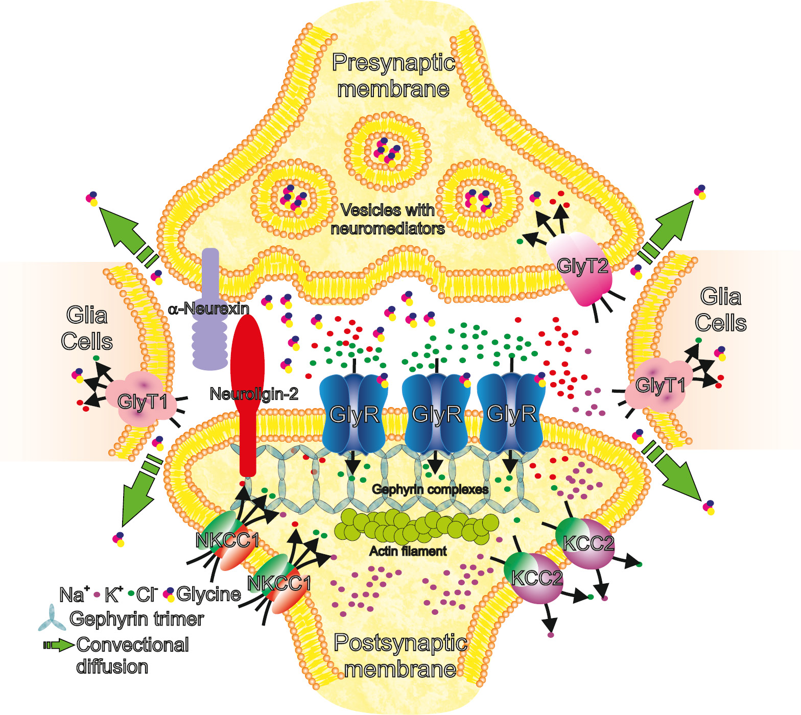 Figure 3 – Schematic representation of glycinergic synapse. Note: A neurotransmitter release from synaptic vesicles is accompanied by a subsequent diffusion into the synaptic cleft and the activation of structured GlyR and gephyrin clusters on the postsynaptic membrane. The increasing concentration of chloride ions in the postsynaptic terminal is regulated by transport through the KCC2 transporter. Structural plasticity of the synapse is mediated by the interaction of α-neurexin (presynaptic membrane) and the neuroligin-2 complex with the structural network of gephyrin trimers in the postsynaptic terminal [43].