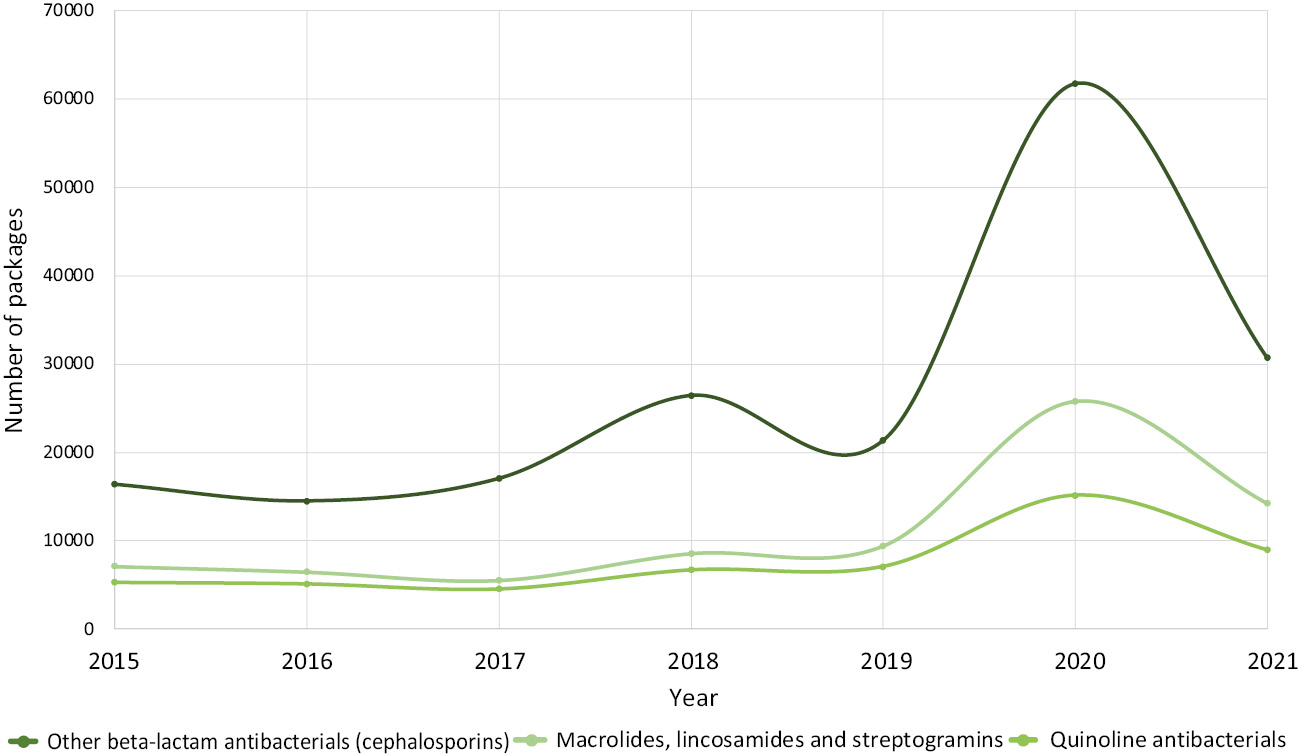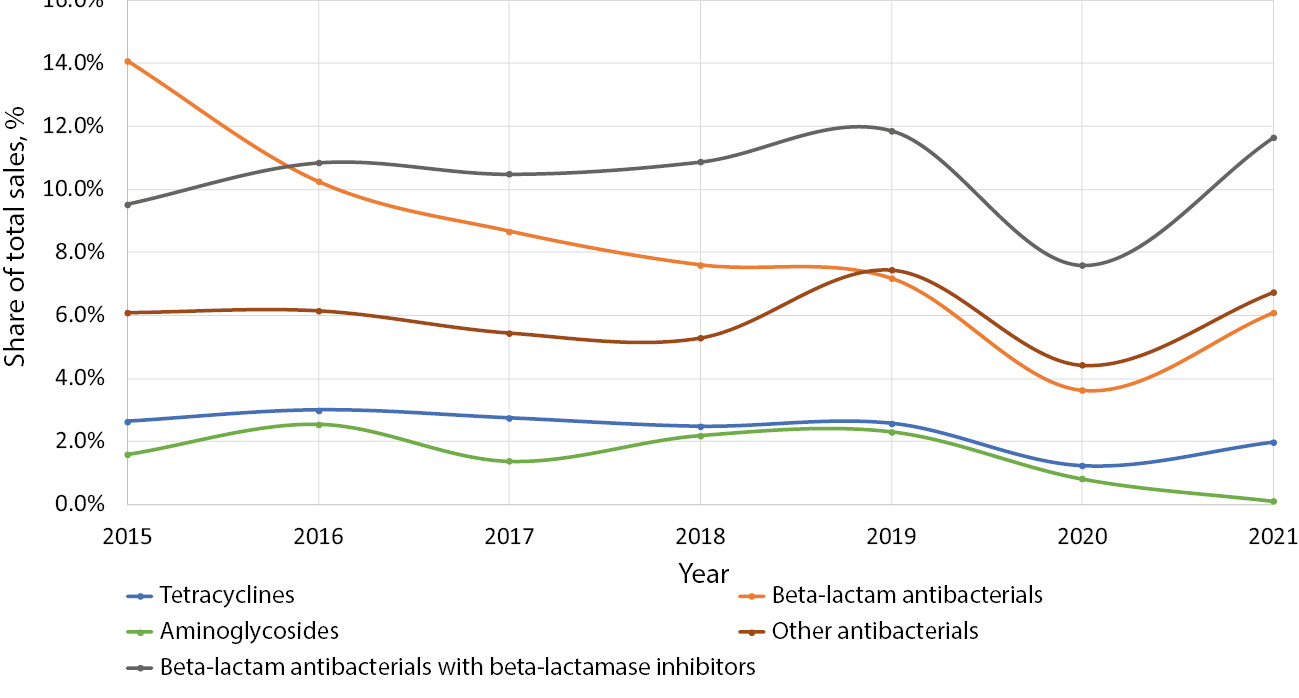 В 2020 г. на фоне значительного увеличения спроса на ЛП АТХ-подгрупп J01D «Другие бета-лактамные антибиотики», J01F «Макролиды и линкозамиды», J01M «Производные хинолона» отмечено снижение доли (от общего количества реализованных упаковок АМП) для препаратов подгрупп J01A «Тетрациклины», J01C «Бета-лактамные антибиотики-пенициллины», J01G «Аминогликозиды», J01X «Другие антибактериальные препараты» и «Бета-лактамные антибиотики с ингибиторами бета-лактамаз». Как видно из рисунка 2, в 2021 г. отмечается возврат к сложившейся картине спроса на АМП в 2015–2019 гг., за исключением аминогликозидов, количество реализованных упаковок, которых в 2019–2021 гг. ежегодно снижалось в среднем на 35% (рис. 2).