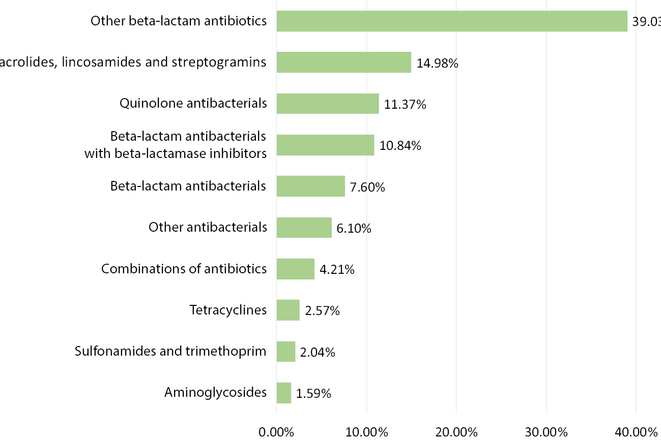 Согласно литературным данным, в амбулаторной практике препаратом выбора первого ряда является амоксициллин, назначаемый перорально при пневмонии, обострении хронической обструктивной болезни легких, остром риносинусите, бронхите, остром тонзиллите, неосложненной инфекции кожи и мягких тканей [8, 15, 17]. Вместе с тем в розничном секторе фармацевтического рынка Самарской области отмечен высокий потребительский спрос на β-лактамные антибиотики.
