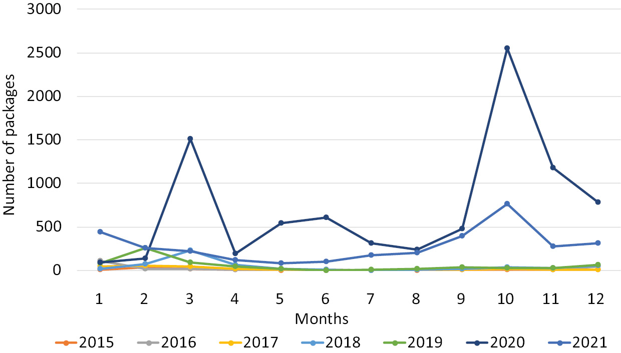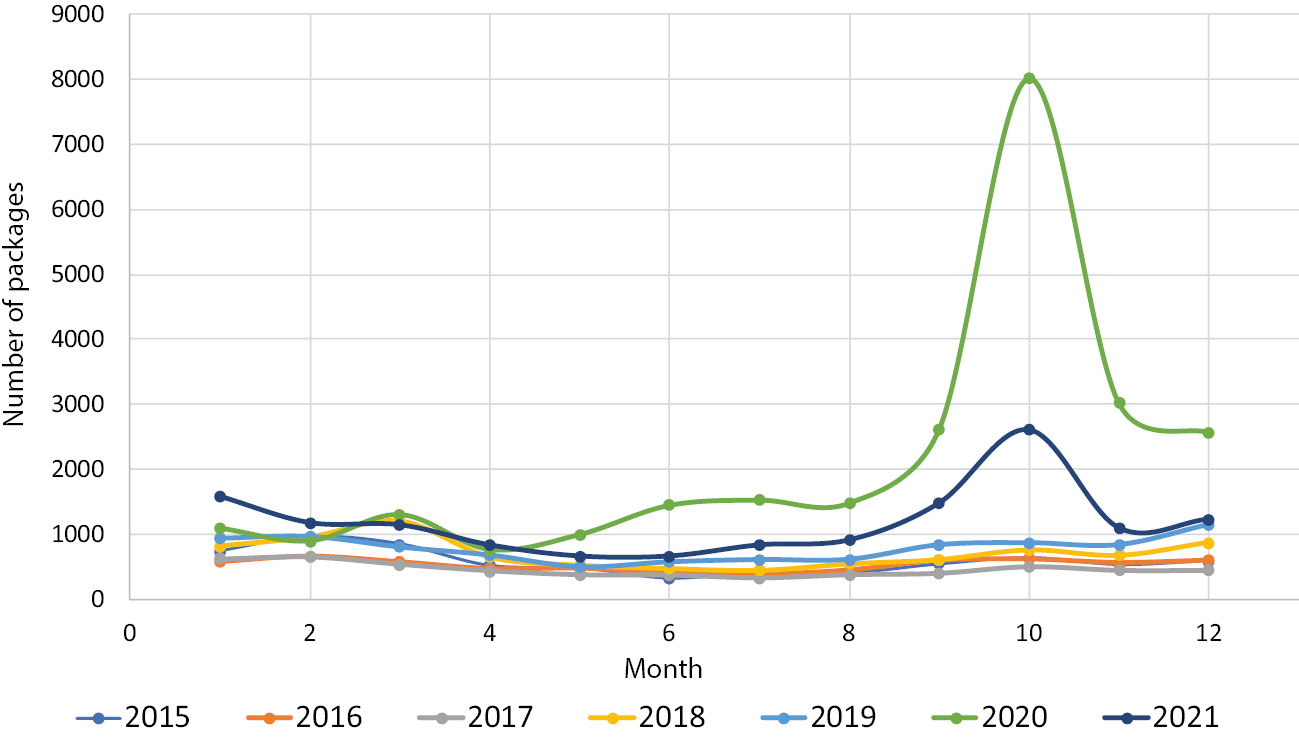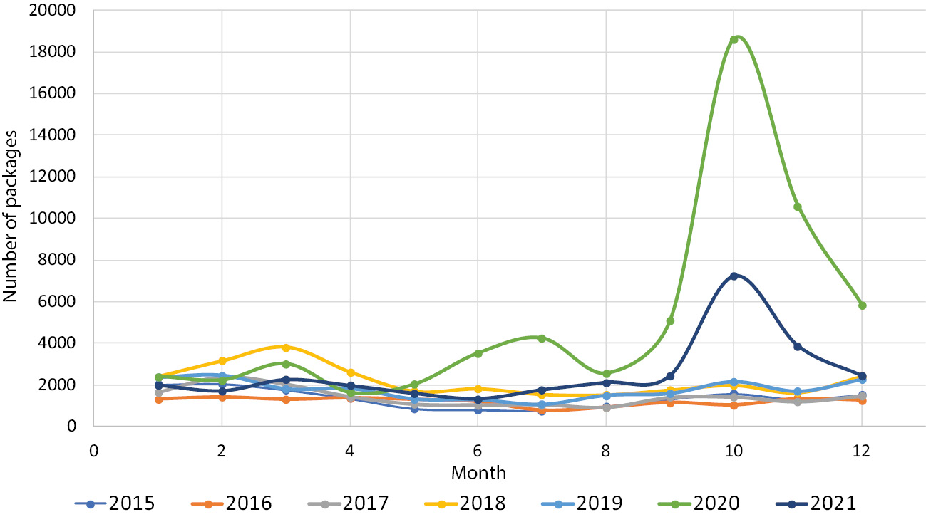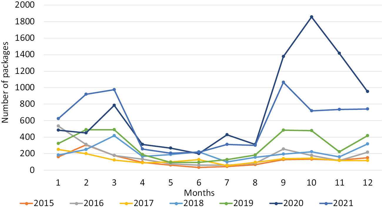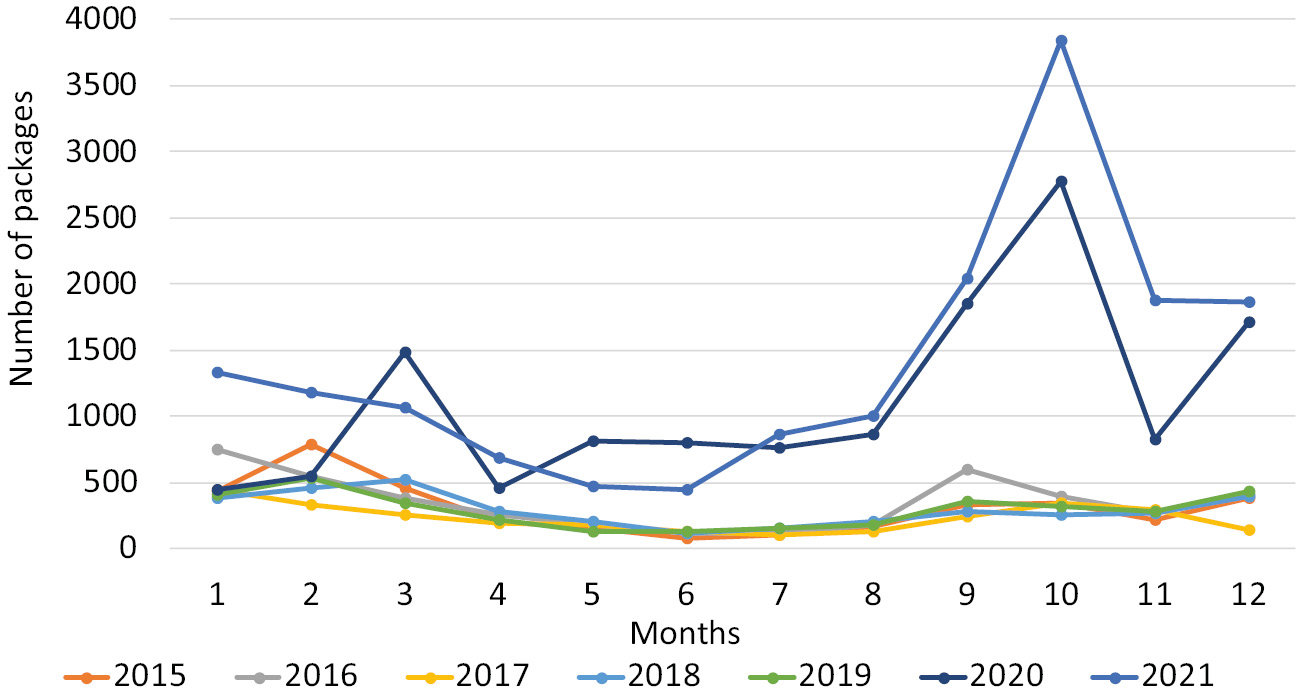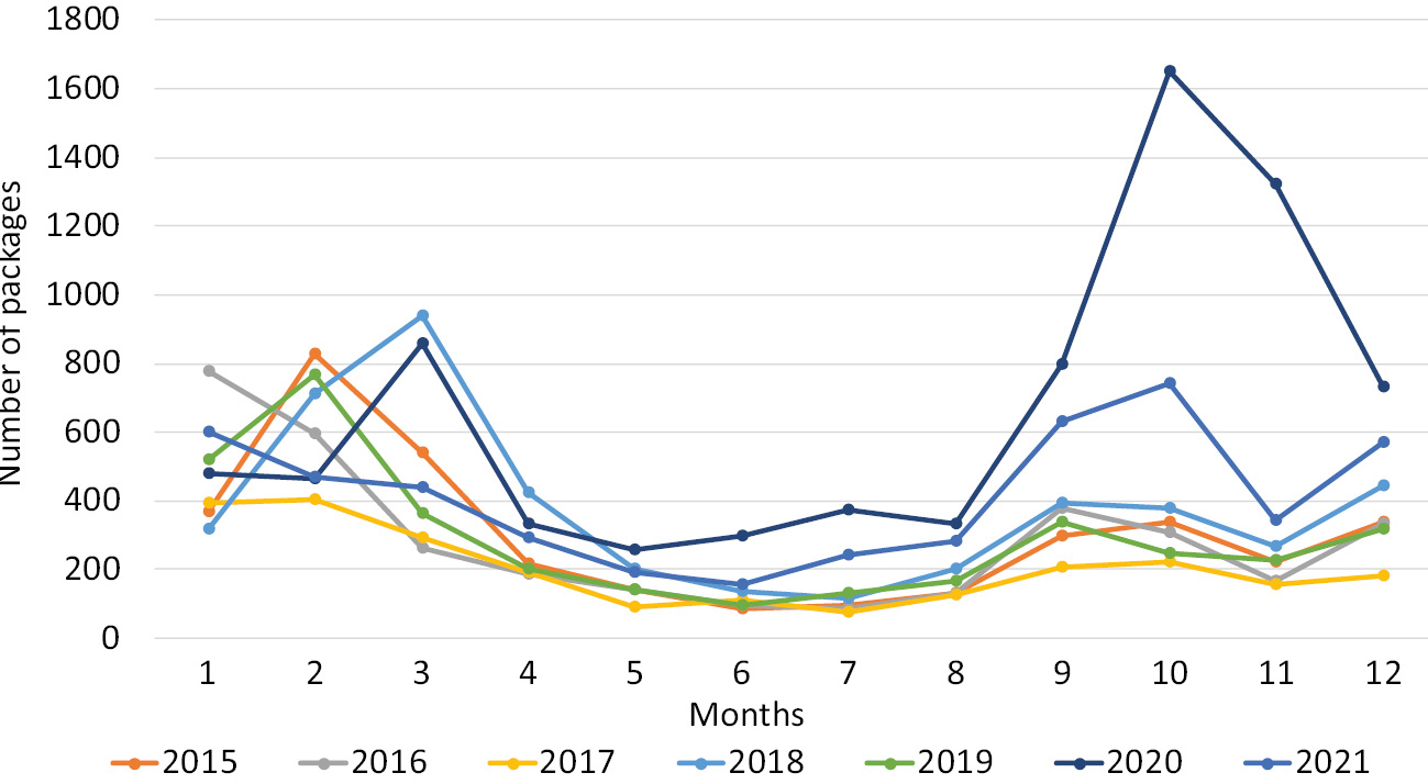 Рисунок 4 – Динамика спроса на препараты АТХ-подгруппы J01D «Другие бета-лактамные антибиотики» в 2015–2021 гг. (по месяцам)
