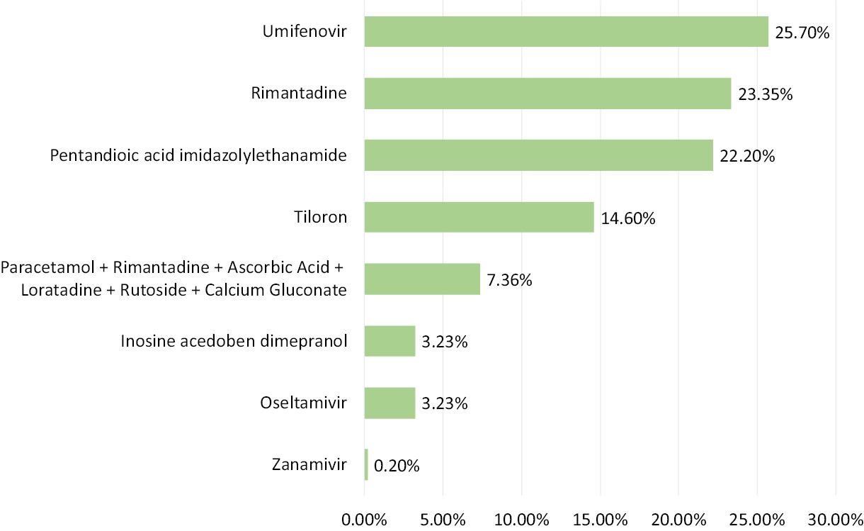 В период распространения новой коронавирусной инфекции (2020 г.) в общей структуре потребления отмечено значительное увеличение доли осельтамивира (до 17,26% по сравнению с 0,71% в 2015 г., 1,60% – в 2016 г., 2,11% – в 2017 г., 3,23% – в 2018 г. и 3,25% – в 2019 г.) и количества отпущенных упаковок (в 23,5 раза по сравнению со средним значением в 2015-2019 гг.). Осельтамивир – ингибитор нейраминидазы, одобренный для лечения гриппа, не имеет документированной активности in vitro против SARS-CoV-2. По-видимому, понимание неэффективности осельтамивира при инфекции, вызванной SARS-CoV-2, и улучшение диагностики привели к снижению в 2021 г. доли осельтамивира от общего объема реализованного спроса до 8,0%.