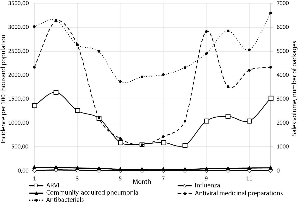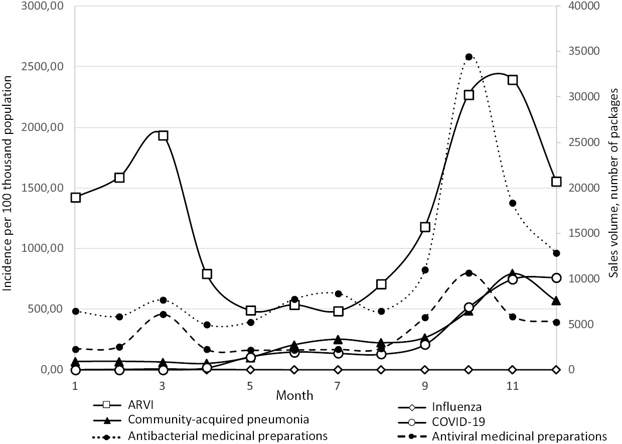 Динамика заболеваемости ОРВИ, COVID-19 и внебольничной пневмонии в 2020 г. во многом имеют похожий паттерн, что, вероятно, больше связано с трудностью распознавания этих форм респираторной инфекции, в основном базирующейся на результатах ПЦР метода выявления РНК SARS-Cov-2. Потребление АМП и противовирусных препаратов тесно связано с заболеваемостью ОРВИ и имеет четкие максимумы в весенний и осенне-зимний периоды. При этом потребление АМП выше, чем противовирусных препаратов. Кумулятивная заболеваемость гриппом в 2020 г. на 25% ниже заболеваемости 2019 г., что может быть объяснено купирующим эффектом санитарных мероприятий во время пандемии COVID-19.