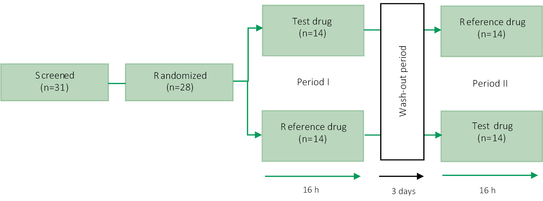 The bioequivalence of drugs was assessed as the 1st stage of a clinical trial with a combined two-stage design (No. CJ051025138). The first stage of this study, i.e. the bioequivalence study, was a randomized two-period crossover study with a single oral fasting dose of 200 mg of test and reference drugs in healthy volunteers.
