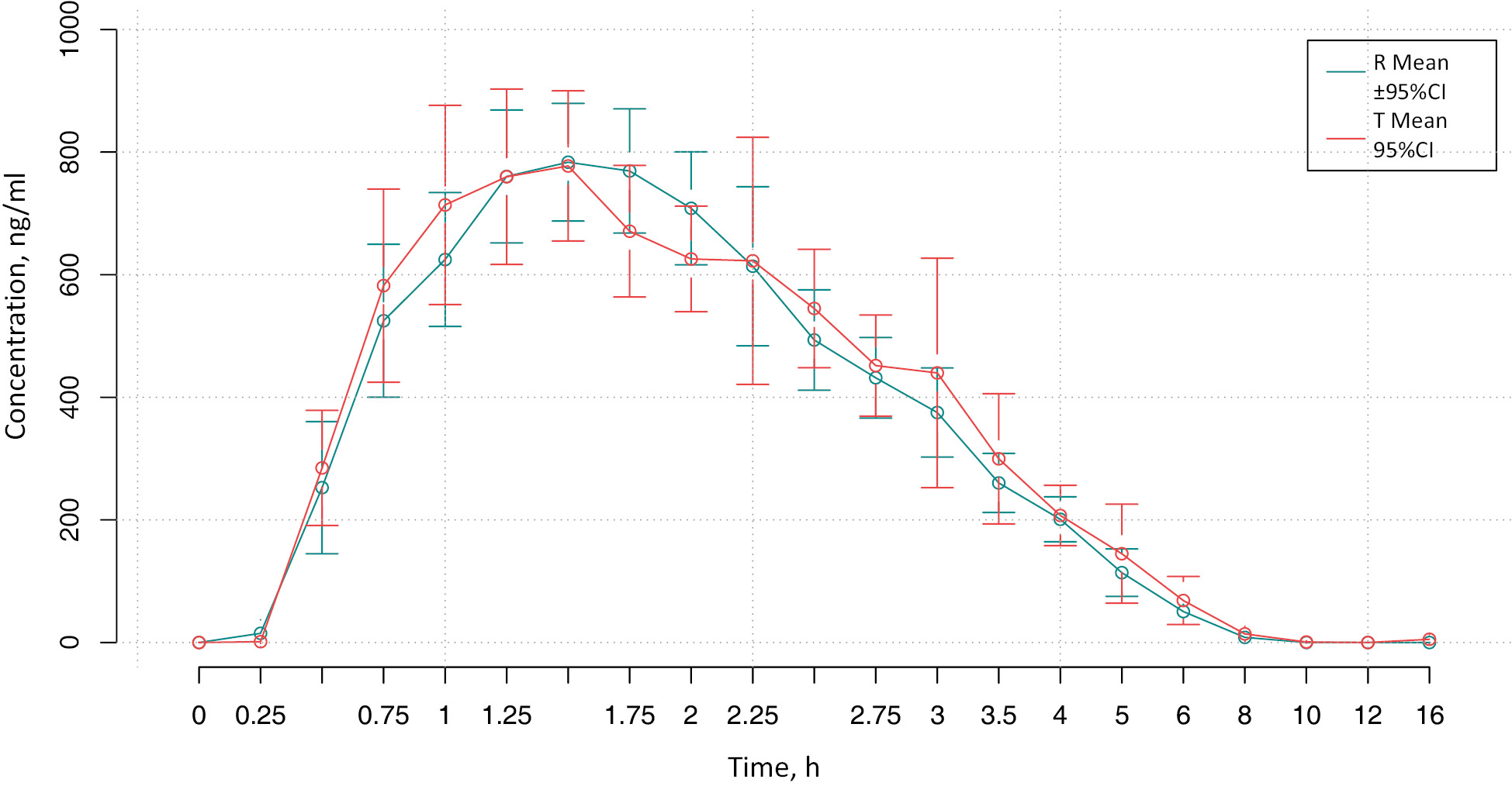 After calculating the PK parameters of the test and reference drugs in this research, a statistical determination of bioequivalence was carried out. According to its results it was found out that the obtained 90% CI fully fit into the required range of 80.00–125.00% for AUC(0–16) and Cmax, which was established in accordance with the protocol and the “Rules for Conducting Bioequivalence Studies of Medicinal Products” within the Eurasian Economic Union, approved by the Decision of the Council of the Eurasian Economic Commission No. 85 dated November 03, 2016, as well as the international guidelines on bioequivalence of the European Medicines Agency (EMA).