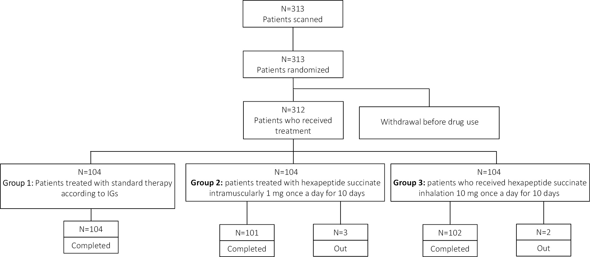 Male and female patients (at least 312 people) aged 18 to 80 years inclusive, hospitalized with COVID-19, meeting the inclusion criteria and not meeting the exclusion criteria, were randomized into 3 groups in a 1:1:1 ratio (Fig. 1).