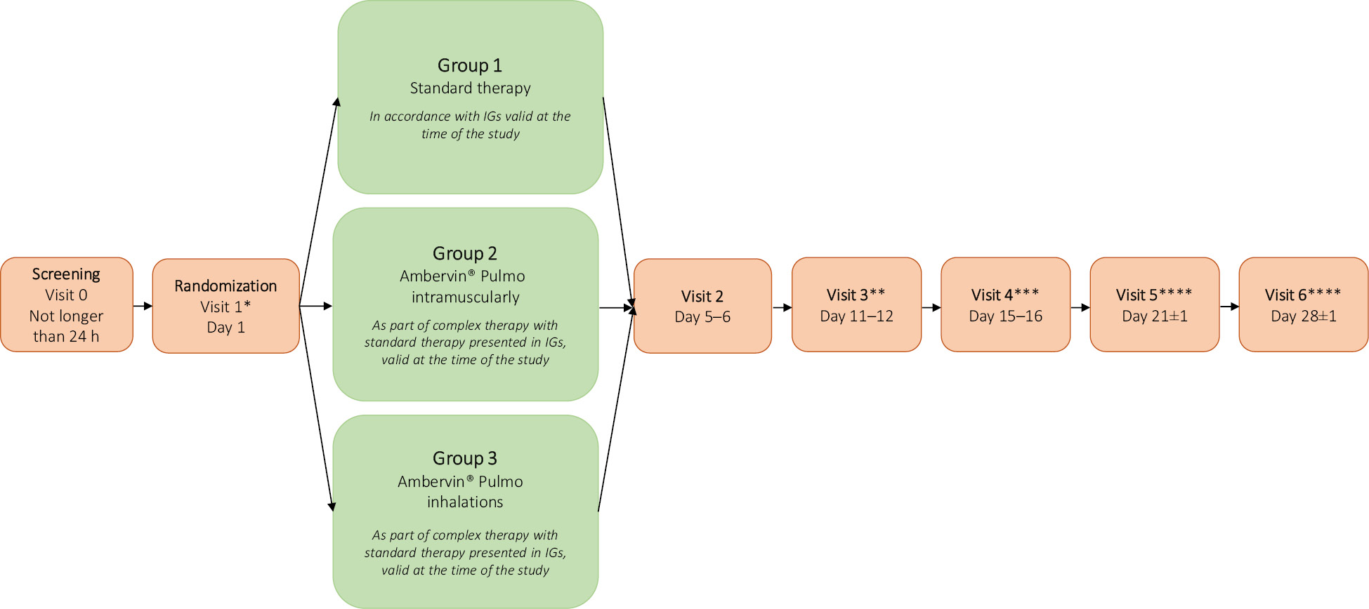 As concomitant therapy, patients in groups 2 and 3 received standard therapy, presented in the BMPs, valid at the time of the study. Intramuscular and inhalation uses of the study drug was carried out in a hospital setting. The design of the study is shown in Fig. 2. The total duration of a patient’s participation in the study was no more than 30 days.