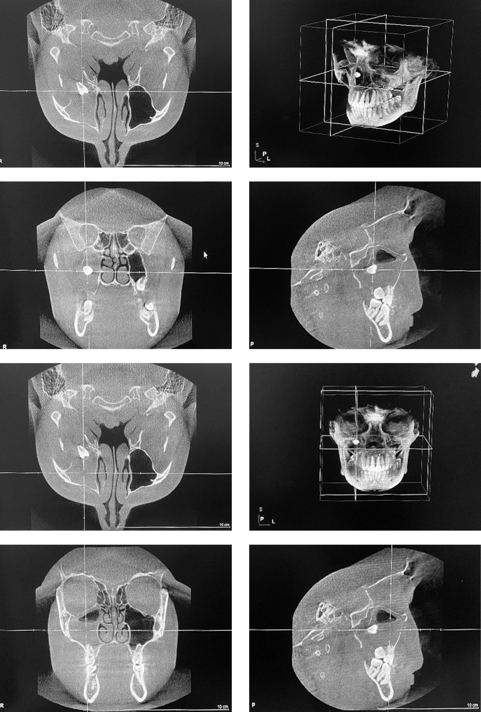 Patient A, 58 years old, was urgently admitted to the Clinic of Otolaryngology of the First Pavlov State Medical University of St. Petersburg with complaints of nasal congestion, difficulty nasal breathing, headache, sensation of pressure and fullness in the maxillary sinuses, and food and water leaking from mouth into the nose. Medical history revealed that the patient had teeth 1.4, 1.5, 1.6 removed approximately a year ago, after which acute right sinusitis developed and an oroantral communication formed. The patient had nasal breathing problems for the past 25 years. The patient had 3 episodes of right maxillary sinusitis within one year. The patient had an episode of severe stress and hypothermia one week prior to hospitalization. Cone beam computed tomography showed subtotal shadowing of both maxillary sinuses with an exudative component, total shadowing of the ethmoidal labyrinth cells, a defect in the right alveolar process of the upper jaw up to 10 mm in the projection of the missing teeth 1.5, 1.6 due to oroantral communication (Figure 3). Objective nasal examination revealed edematous and hyperemic mucosa, moderate bilateral mucopurulent discharge, deflected nasal septum, and a positive right nasal-oral test. After systemic antibacterial therapy and puncture, the acute inflammation was treated, but right oroantral communication and nasal breathing difficulties persisted. The patient underwent combined multidisciplinary treatment of the intranasal structures, including endoscopic septoplasty, endoscopic right maxillary antrostomy, and bilateral inferior vasotomy by an otolaryngologist and plastic surgery of the oroantral fistula by an oral surgeon to restore nasal breathing, improve sinus aerodynamics, and adequately eliminate the stomatogenic source of infection. After 7 days, a follow-up cone beam computed tomography of the sinuses and maxillofacial region showed complete restoration of airiness in both maxillary sinuses (Figure 4). Objectively, the patient reported improved nasal breathing, pain relief, and no communication between the sinuses and oral cavity.