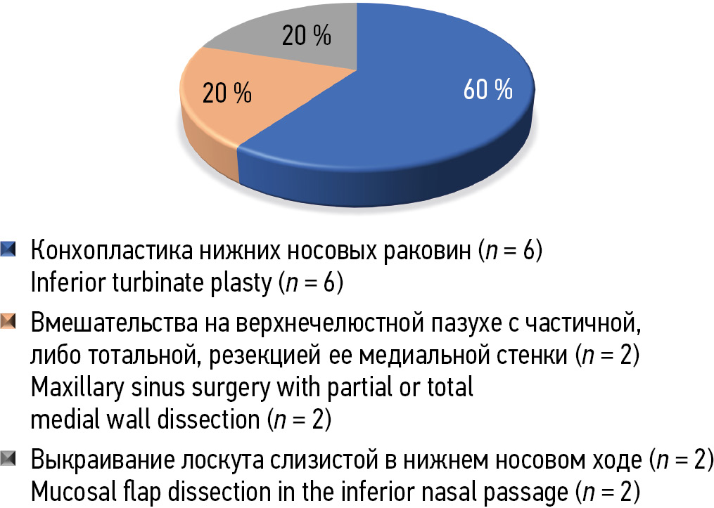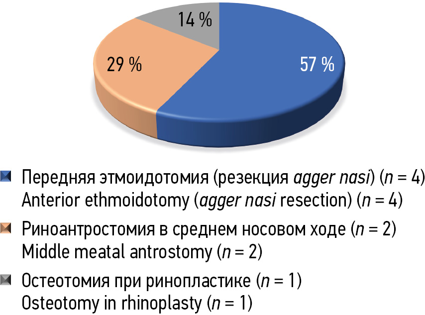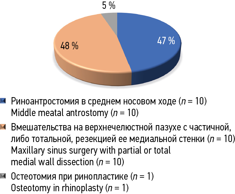Эндоскопическая риноантростомия в среднем носовом ходе | 12 (31,58) |