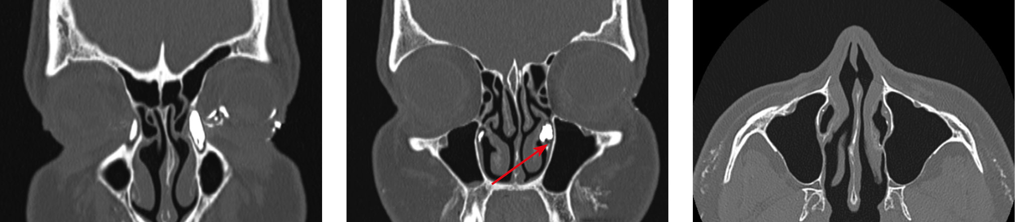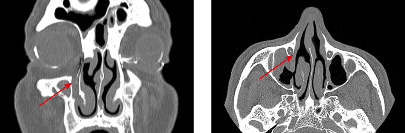 Fig. 4. Right nasolacrimal duct obliteration at the level of the upper third after right retrograde infundibulotomy. Multislice computed tomography at 3 months after FESS (arrows)