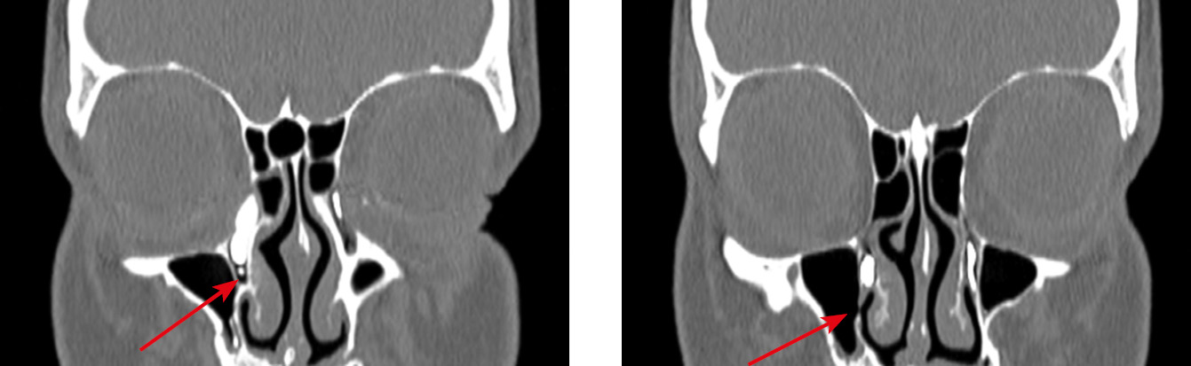 Рис. 4. Облитерация носослезного протока справа на уровне верхней трети после осуществления ретроградной инфундибулотомии справа. Мультиспиральная компьютерная томография выполнена через 3 мес. после проведенной FESS (стрелки)