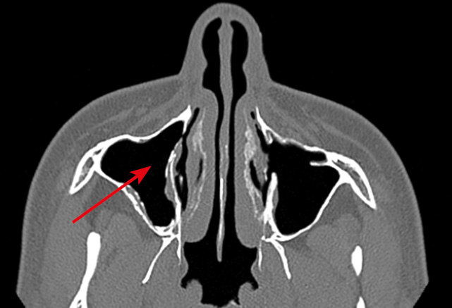 Fig. 10. Status post left maxillary medial sinusotomy, septoplasty. Chronic dacryocystitis (OS) with partial patency of the nasolacrimal duct, dacryostenosis of the nasolacrimal duct at the level of the lower third of the nasolacrimal canal (arrow)