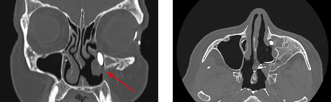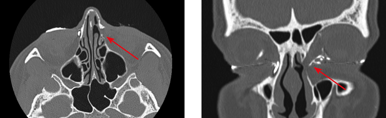 Fig. 8. Status post rhinoseptoplasty. Left lacrimal duct obstruction after lateral osteotomy (arrows)