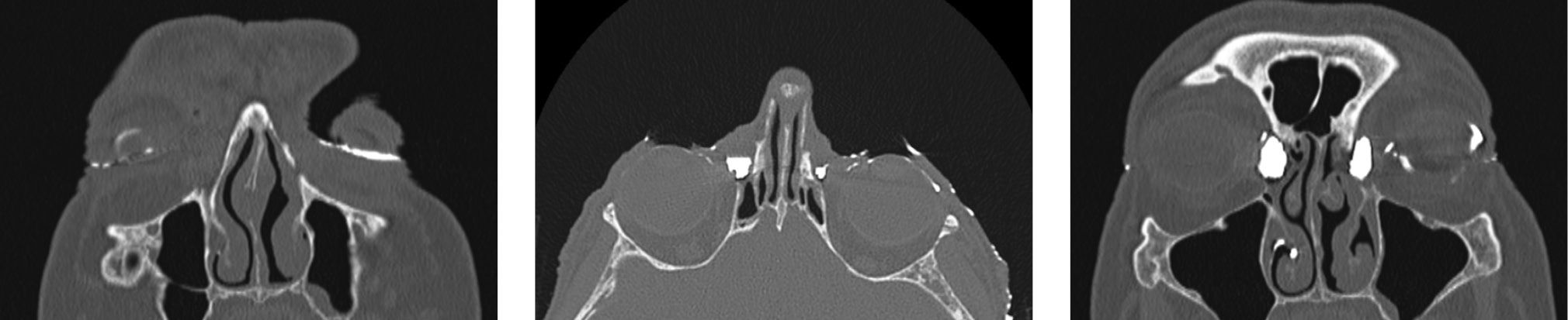 Интересен тот факт, что в двух случаях нашей серии нарушение проходимости СОП возникло после осуществления вмешательств на структурах наружного носа, а именно при проведении остеотомии в ходе ринопластики (рис. 8–10). По данным литературных источников, такие осложнения встречаются крайне редко, в основном при латеральной остеотомии [23, 24].