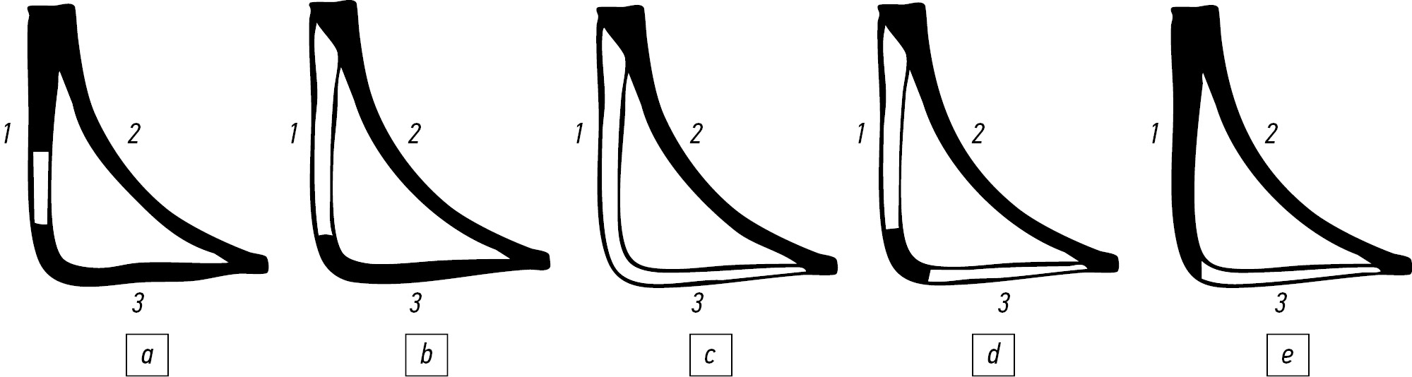 Рис. 2. Схема различных наружных методов операции на лобной пазухе. Не заштрихованные участки костных стенок резецированы: a — техника Ogston–Luc; b — техника Kuhnt; c — техника Riedel; d — техника Killian; e — техника Ritter–Jansen (Lynch–Howarth). Стенки лобной пазухи: 1 — лицевая; 2 — мозговая; 3 — глазничная.