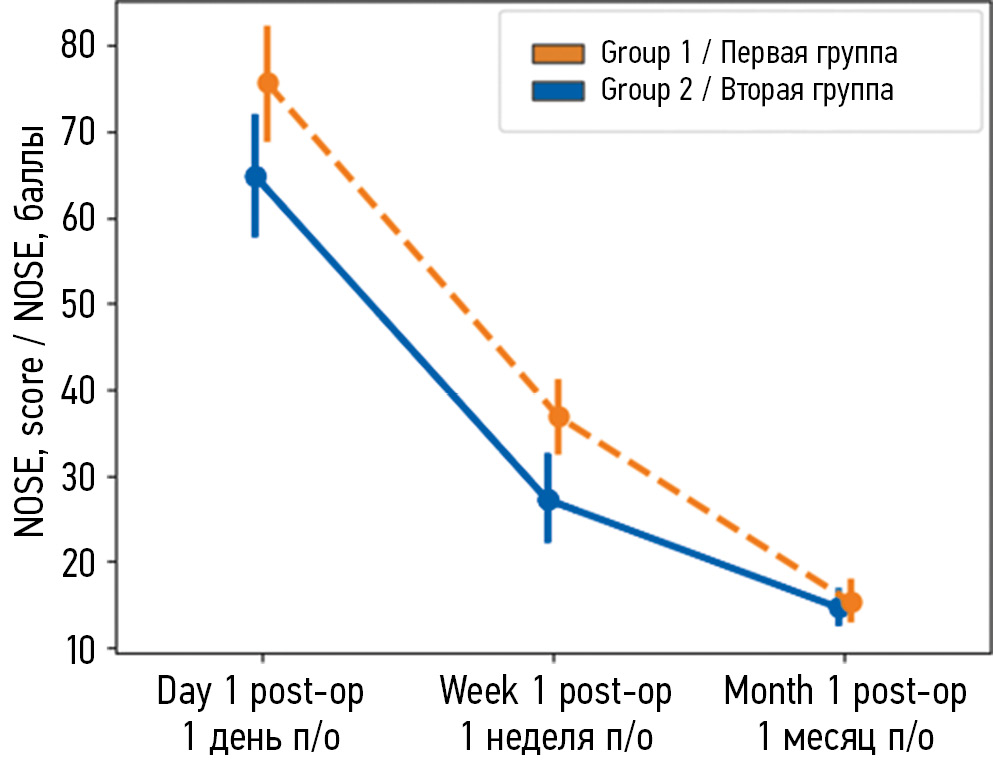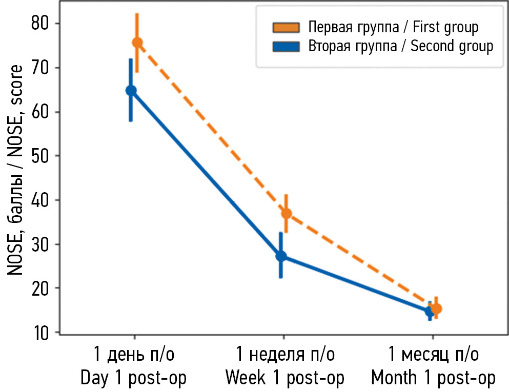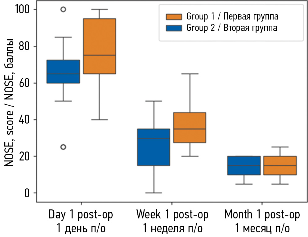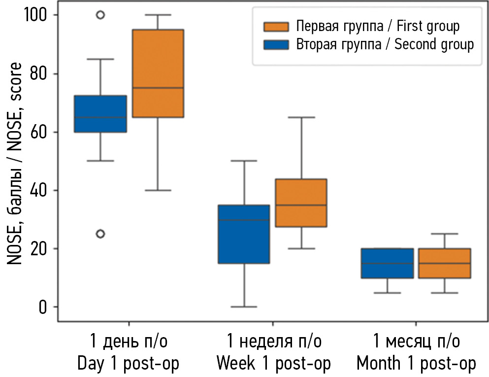 Рис. 1. Сравнение показателей по шкале NOSE между исследуемыми группами в течение месяца после операции (п/o).