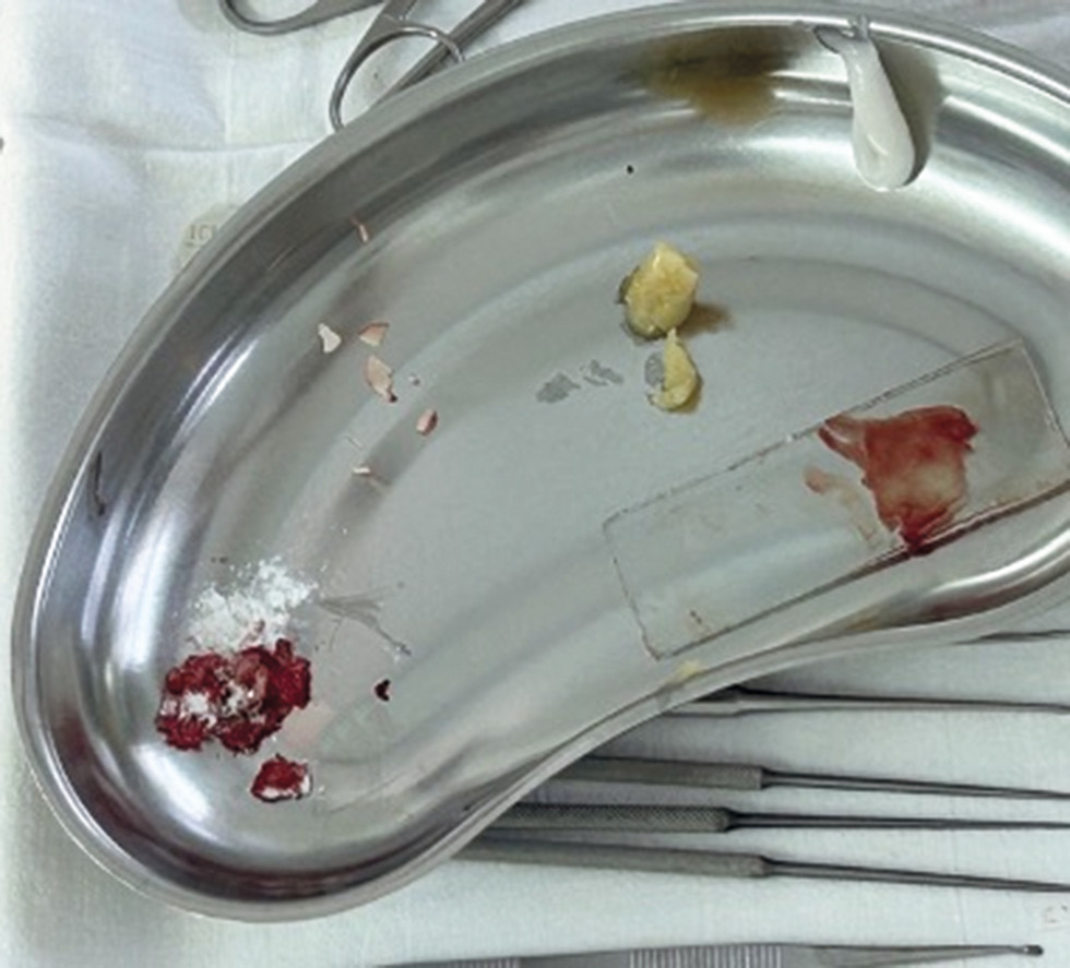 Fig. 1. Plastic materials: a, bone chips mixed with ceftriaxone powder; b, plasma gel; c, temporalis muscle fascia.