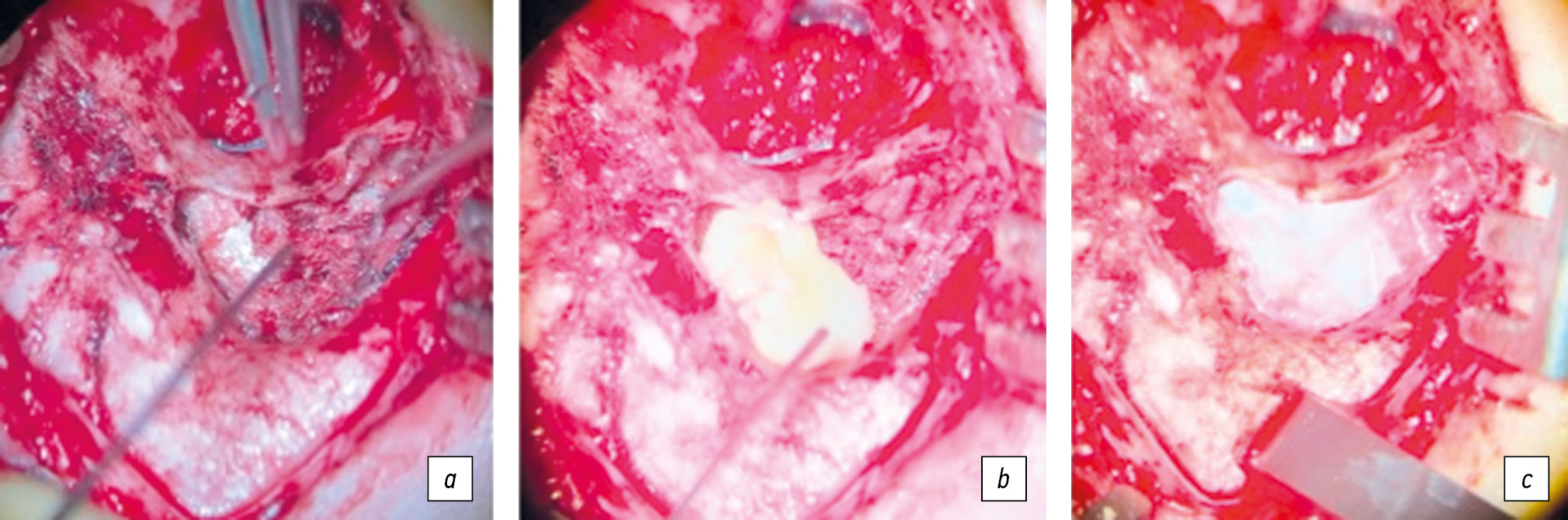 Fig. 2. Antromastoid obliteration: а, bone chips with platelet-rich plasma; b, plasma gel; c, temporalis muscle fascia.