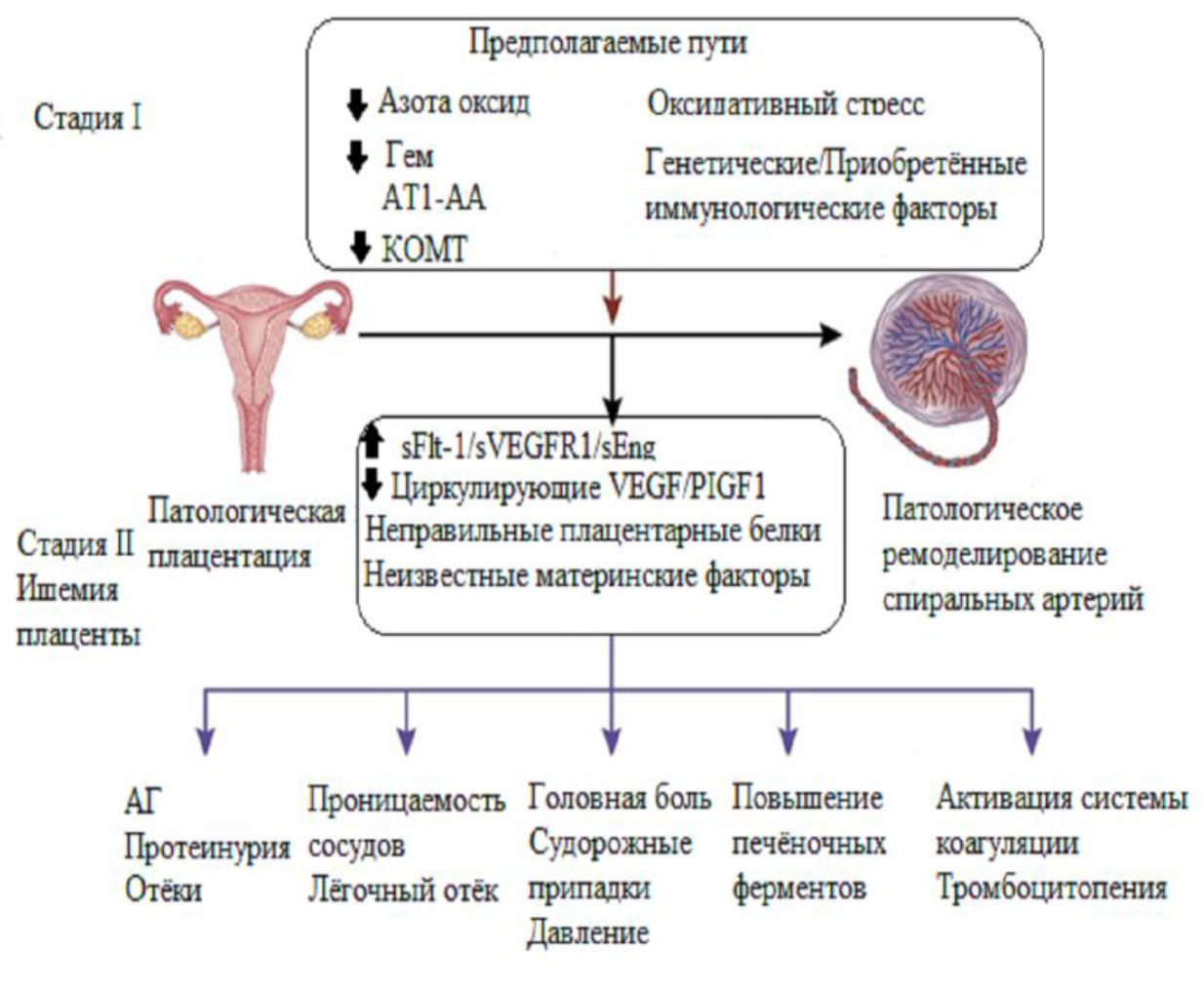 Таким образом, узловые патогенетические звенья преэклампсии могут быть представлены следующим образом: недостаточная инвазия цитотрофоблата в спиральные артерии → нарушение их ремоделирования → потеря вазопрессорной рефрактерности → плацентарная ишемия → синтез антиангиогенных факторов → повреждение эндотелия → генерализованная вазоконстрикция.
