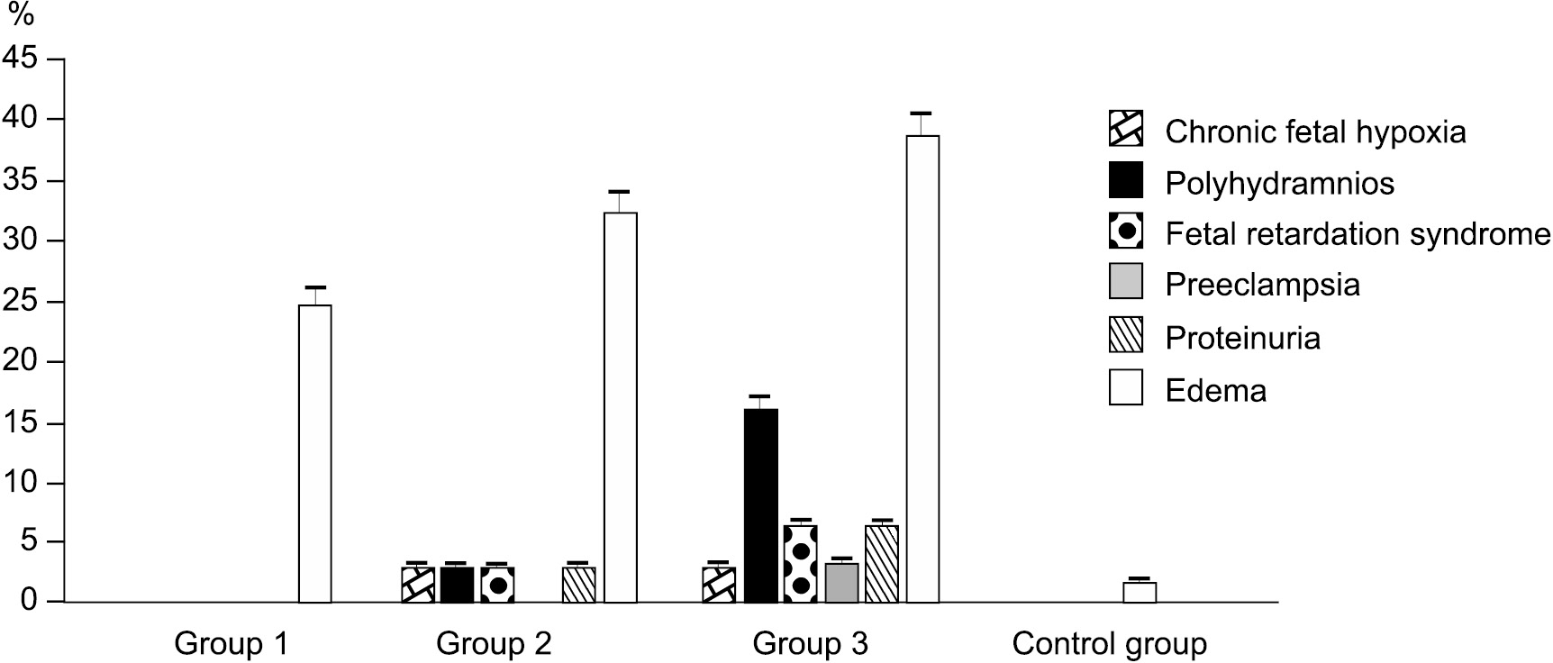 These data indicate that complications, such as proteinuria, preeclampsia, and polyhydramnios, were more often significantly recorded (p ≤ 0.05) in group 3. Additionally, women in this group showed an increased tendency to edema.