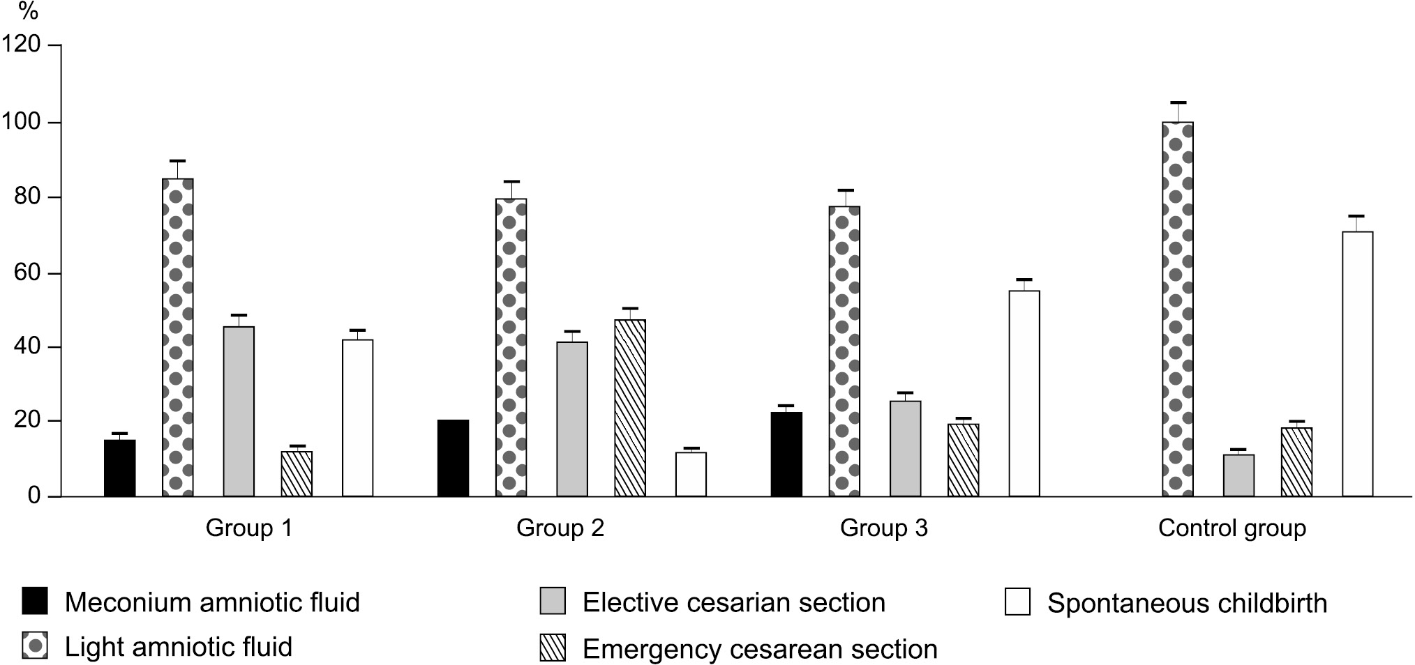 The obtained data indicated that childbirth was the most physiological in the control group, whereas the frequency of natural childbirth decreased in the main groups, amounting to the smallest number in group 2 (11.8%; p < 0.05).