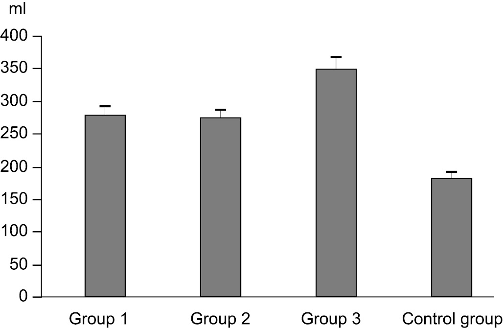 Significantly greater blood loss (p ≤ 0.05) was registered in group 3 (348.7 ± 17.4 ml) compared with groups 1 and 2 (278.6 ± 13.9 and 273.5 ± 13.7 ml, respectively) and the control group (181.8 ± 9.1 ml).