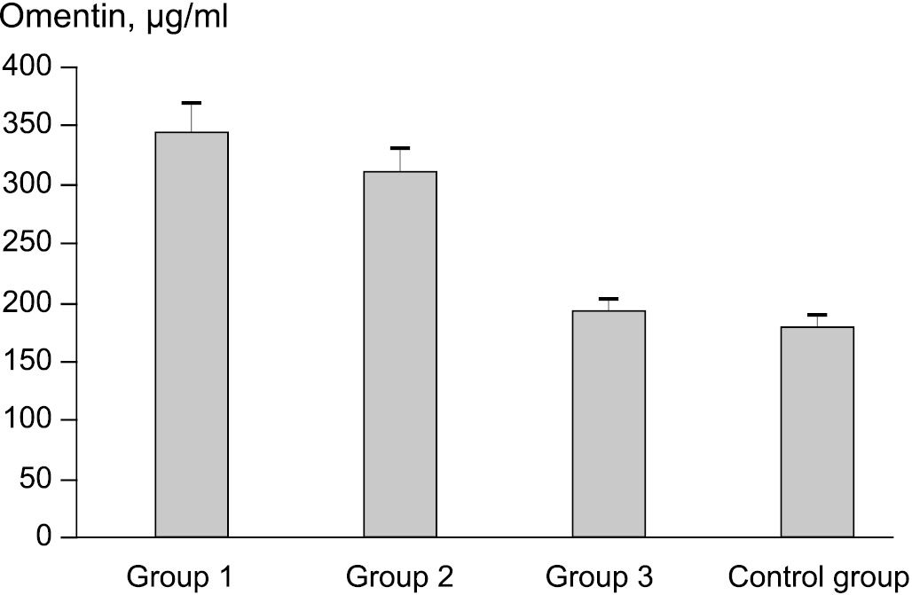 Fig. 7. Blood serum omentin level in women with obesity at a gestational age of 8–9 weeks.