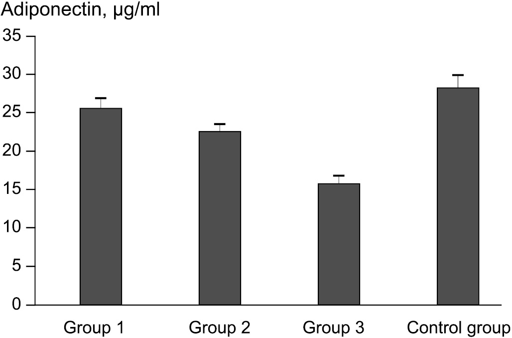 Fig. 8. Blood serum adiponectin level in women with obesity at a gestational age of 8–9 weeks.