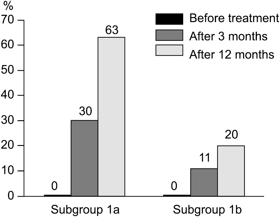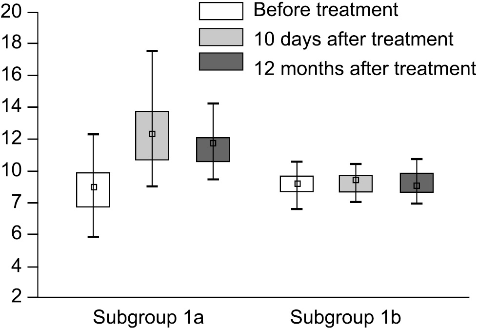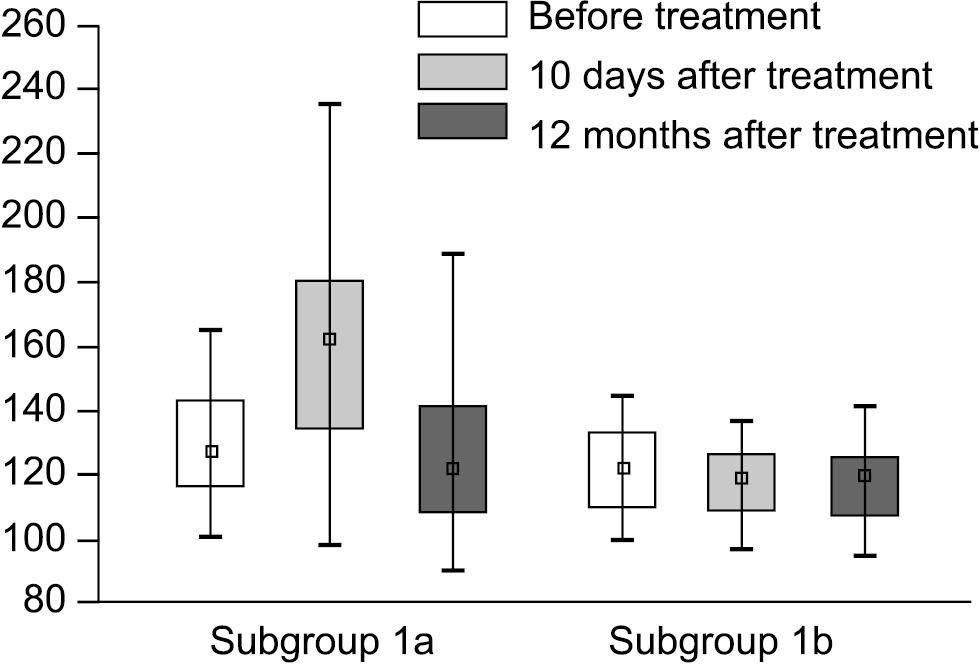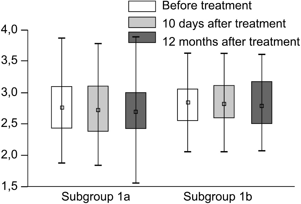The symbol * indicates values that have significant differences with the control group (Mann–Whitney test, p <0.05); р1 ― significant difference in the parameters of subgroup 1a compared with subgroup 1b after 10 days (p <0.05); р2 ― significant difference in the indices of subgroup 1a compared with subgroup 1b after 12 months (p <0.05); р3 ― significant difference in the indices of subgroup 1a compared with values before treatment (p <0.05); р4 ― significant difference in the indices of subgroup 1b with values before treatment (p <0.05).