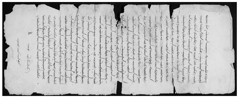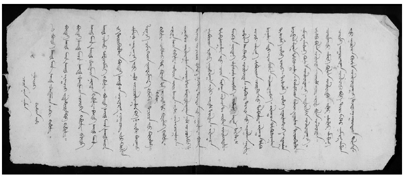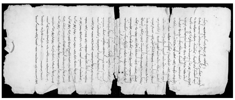 The paper introduces three fragments of an Oirat manuscript of the Sungdui, or “Collected Dharani”, preserved at the Institute of Oriental Manuscripts. The fragments became part of the collection of the Russian Academy of Sciences in the 18th c., but had not been described until 2022. The manuscript is of special value, as only three other specimens of the Sungdui in Clear Script have been accounted for (these three manuscripts are preserved in Ulaanbaatar, Mongolia). The St. Petersburg fragments come from a manuscript that was created between 1748 and 1795, presumably, in the Kalmyk Khanate. The dates were established based on the watermark found on the paper of one of the folios, and an inscription that was left on the same folio by Johannes Jährig, the first scholar to catalogue the Mongolian and Tibetan collection of the Academy. In this paper, the text of the folios is published along with a commentary on the content and possible origin of the manuscript.