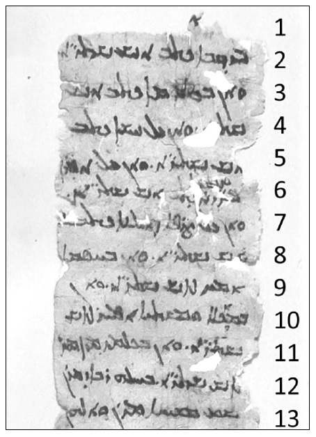 The amulet is lacking its initial and final parts and contains 78 lines, the first of which preserves only one recognizable letter. The text is written in black ink with occasional use of red ink. There is a word in red ink that is repeated continuously throughout the text, on ll. 17, 19, 23, 31, 48, 62 and 78 (on the nature and function of this word, see below). Moreover, there are punctuation signs in red ink on ll. 24, 70, 72, 74, 75, 76 and 78. The text is written in an irregular script of East Syriac origin with elements of monumental and cursive writing; it shares common features with some Syriac and Old Turkic texts in Syriac script found in Qara Qoto (also referred to as Khara Khoto or Khara-khoto in the literature), an abandoned city located in Inner Mongolia.23