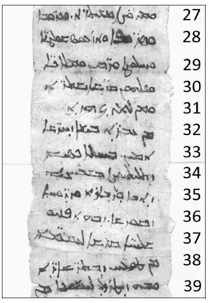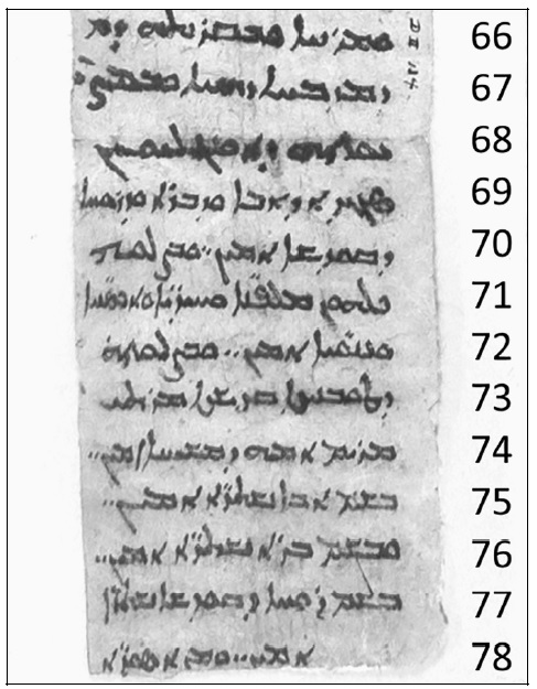 A distinctive feature which is observed throughout the manuscript is the use of ligatures, such as ܬܐ (ll. 16, 21, 23, 27, 34, 44, 46(?), 52, 53, 54, 73), ܠܐ (l. 48; this seems to be accidental due to the shortage of space at the end of the line), and ܕܬ (ll. 39, 55; this is used exclusively in the word ܕܬܪܕܬ, “which expelled” and is a ligature less commonly seen in Syriac manuscripts). The use of diacritics throughout the text is irregular. In some cases, seyame (a plural indicator) may be used as an indication of vocalization, e.g. in the demonstrative pronoun ܗܕܐ̤ (l. 31)/ܗܕ̈ܐ (l. 62, placed above the letter instead of below it). In some other instances, however, we cannot explain their use.24
