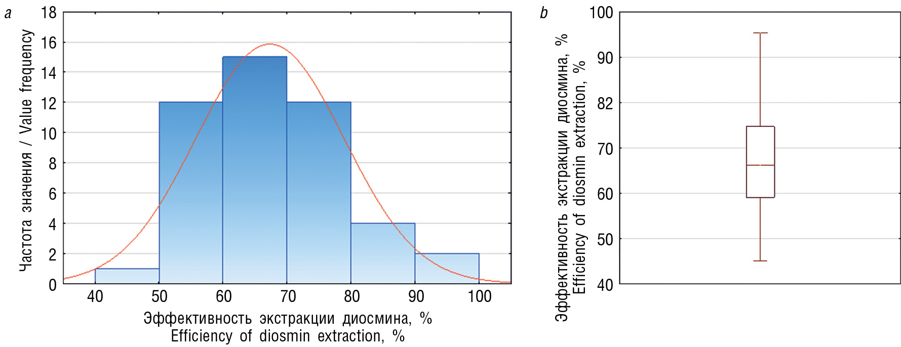 На рис. 1 представлены средства визуальной оценки соответствия распределения массива данных эффективности экстракции диосмина закону нормального распределения на примере лекарственного препарата Детралекс 1000 мг. Гистограмма распределения адекватно описана кривой нормального распределения Гаусса, диаграмма разброса данных (медиана с интервалами нижнего и верхнего квартилей) симметрична.