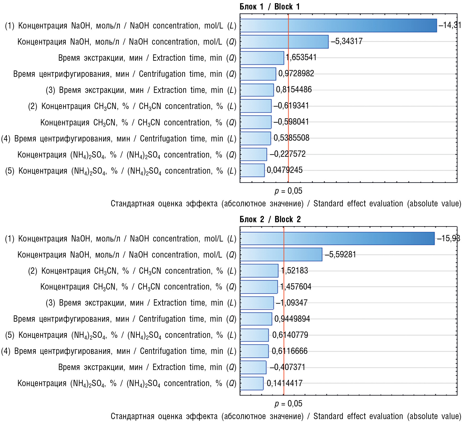 В качестве параметра оптимизации была выбрана эффективность экстракции (далее — степень извлечения диосмина из исследуемой лекарственной формы, %). Основные факторы, влияющие на параметр оптимизации: концентрация натрия гидроксида (экстрагент), моль/л; концентрация ацетонитрила (растворитель для разрушения мицеллярных структур диосмина), %; время экстракции, мин; время центрифугирования, мин; концентрация аммония сульфата (высаливающий реагент), %.