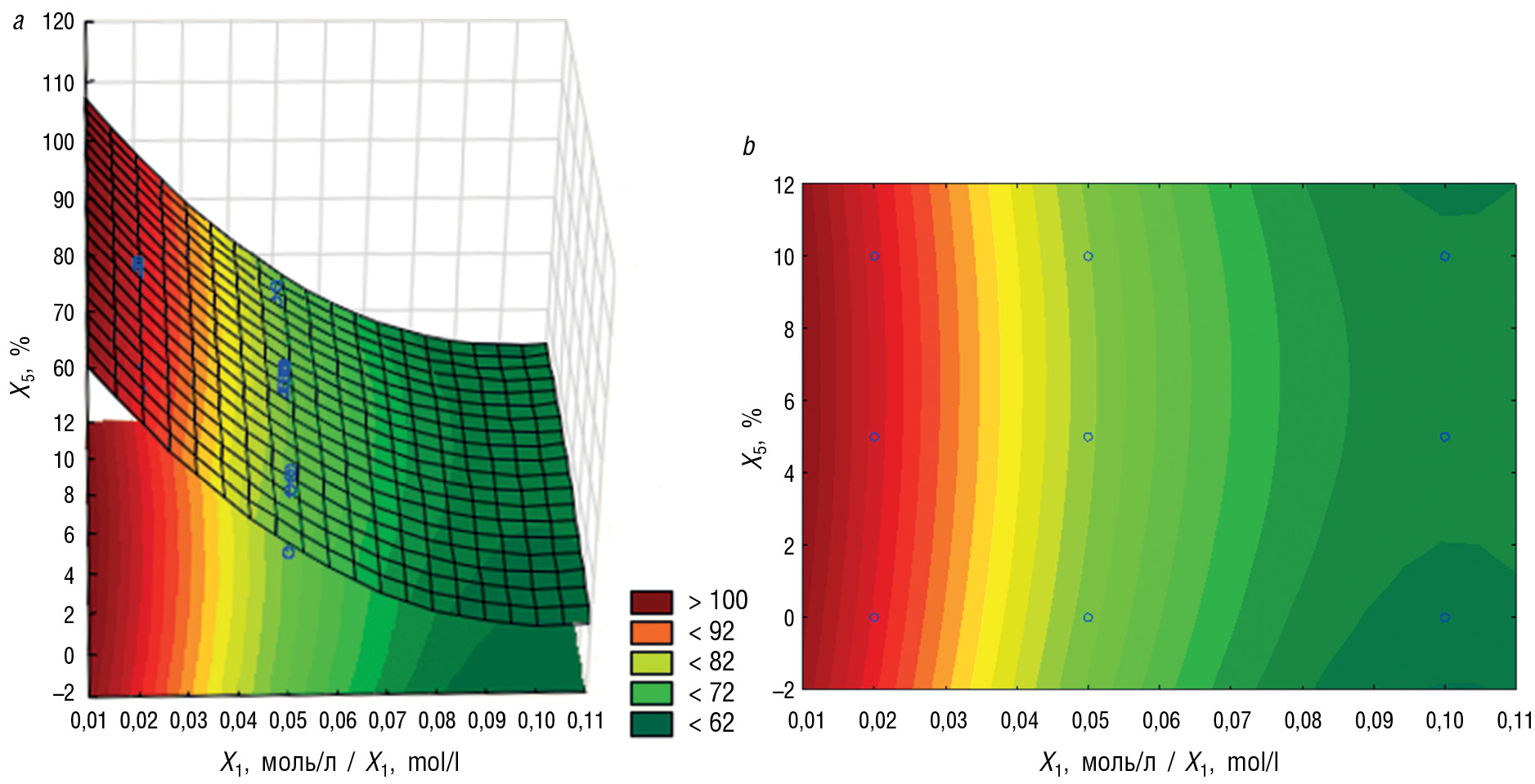 Рис. 3. Поверхность отклика (a) и контурная диаграмма (b) зависимости эффективности экстракции диосмина от факторов Х1 и Х5 (на примере лекарственного препарата Флебофа, 600 мг) / Fig. 3. Response surface (a) and contour diagram (b) of the dependence of diosmin extraction recovery on factors X1 and X5 (through the example of Phlebopha®, 600 mg)