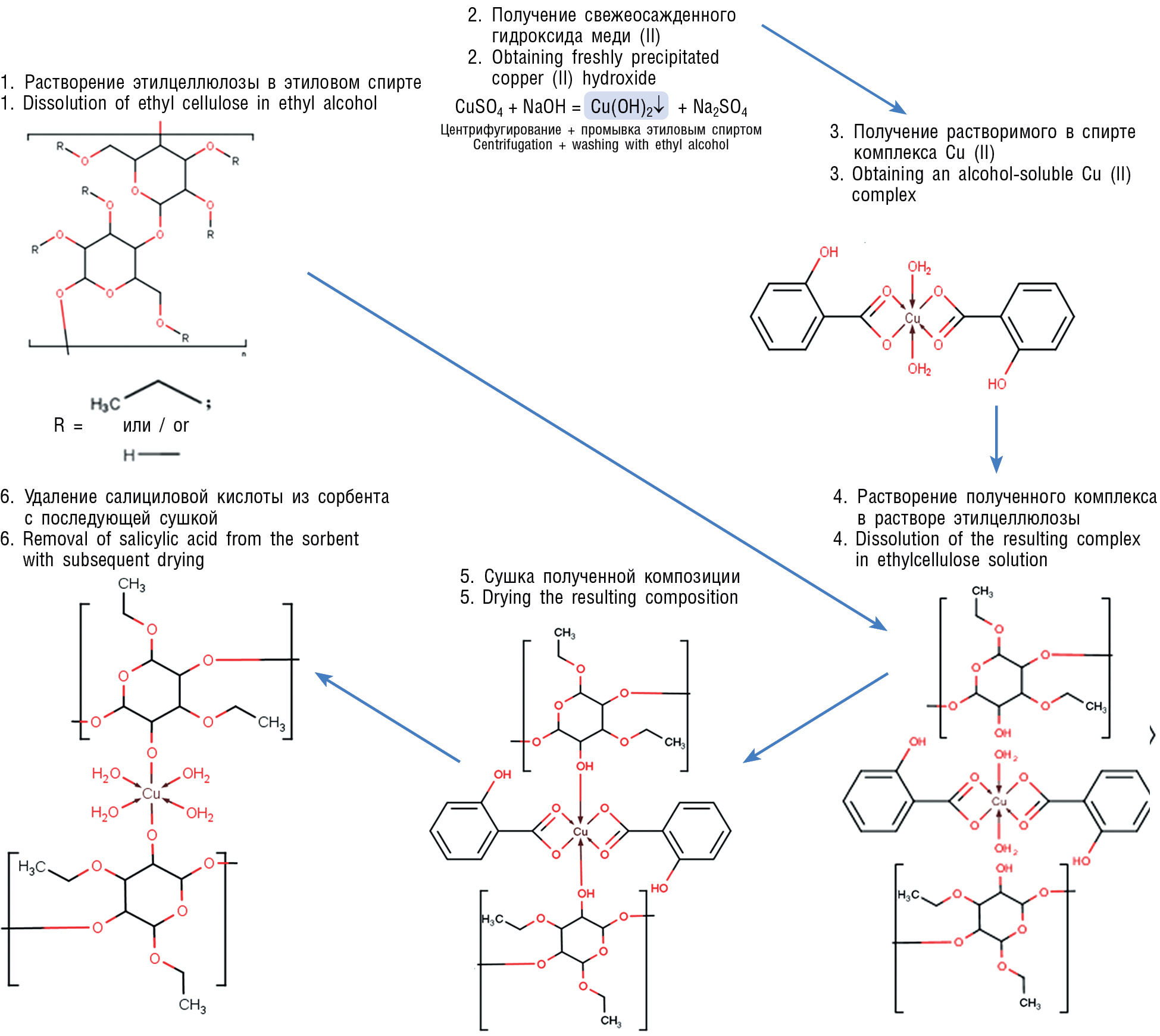 Применение сорбентов позволяет осуществлять очистку и/или изолирование аналитов различной химической природы, что приводит к повышению уровня селективности, точности и чувствительности инструментальных методов анализа. Особое место в ТФЭ занимают сорбенты на основе производных целлюлозы. Известно использование микрокристаллической, нанокристаллической и молекулярно-импринтированной целлюлозы для получения сорбентов для ТФЭ с целью определения уровня загрязнения некоторых примесей в объектах аналитического контроля [6]. Однако, как правило, из-за высокой гидрофильности основного компонента — целлюлозы — уровень селективности получаемых сорбентов достаточно низкий. Использование некоторых модифицированных видов целлюлозы позволяет решить данную проблему. Например, этилцеллюлоза, ввиду высокого содержания этоксильных групп, обладает меньшим уровнем гидрофильности, чем микрокристаллическая целлюлоза, что упрощает процесс пробоподготовки образцов в полярных растворителях. Нами впервые предложена методика получения сорбента для ТФЭ салициловой кислоты из водных растворов, заключающаяся в иммобилизации комплекса меди с салициловой кислотой в этилцеллюлозе, с последующей сушкой и удалением салициловой кислоты из пор сорбента (рис. 1).