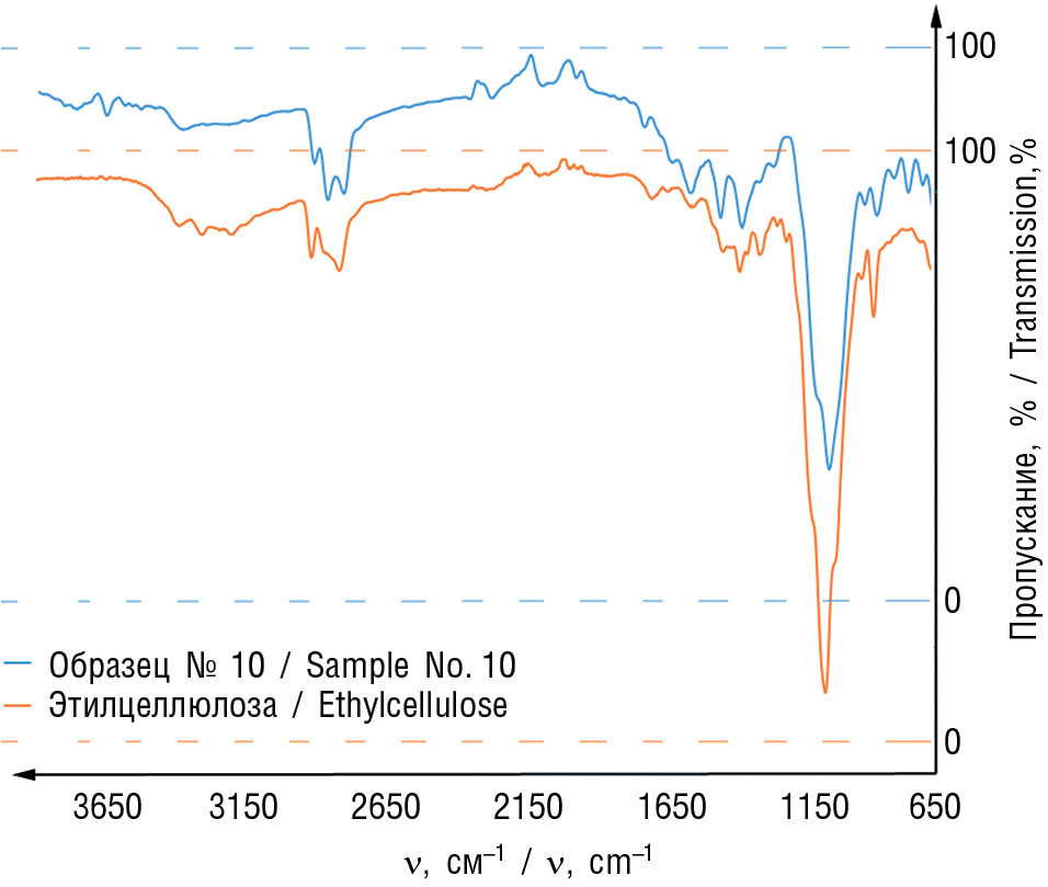 Рис. 2. ИК-спектр стандартного образца этилцеллюлозы и образца сорбента № 10 / Fig. 2. IR-spectrum of ethylcellulose reference sample and sorbent sample No. 10