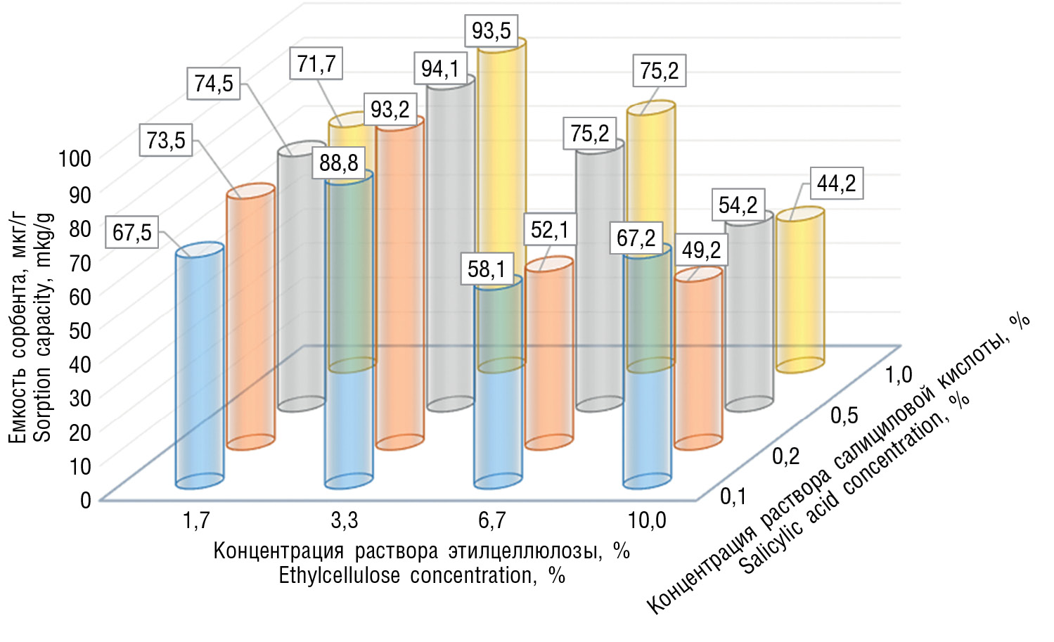 Емкость образцов этилцеллюлозных сорбентов по салициловой кислоте находилась в диапазоне значений 44,2–93,5 мкг/г сорбента. Максимальное значение емкости было отмечено для образца сорбента № 10, полученного с использованием в синтезе 3,3 % раствора этилцеллюлозы и 0,5 % раствора салициловой кислоты (рис. 3).
