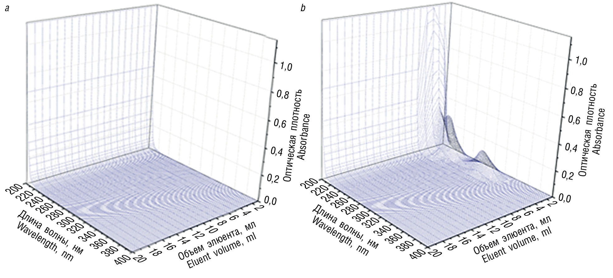 Далее осуществляли элюирование раствором натрия гидроксида концентрацией 0,1 моль/л со скоростью 0,2 мл/мин, отбирали каждые 1 мл элюата, доводили объем раствора до 5 мл водой очищенной и регистрировали оптическую плотность полученного раствора в диапазоне длин волн 200–400 нм (раствор сравнения – раствор натрия гидроксида концентрацией 0,1 моль/л). На полученной хроматограмме (рис. 4, b) зарегистрированы два пика поглощения при длинах волн 230 и 298 нм соответственно. Это подтверждает наличие салицилат-иона в первых порциях элюата (до 5 мл). Натрия гидроксид переводит салициловую кислоту в ионизированную форму, которая десорбируется с относительно неполярной этилцеллюлозной матрицы полимера.