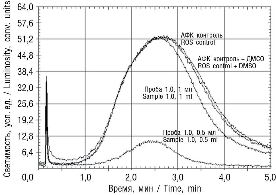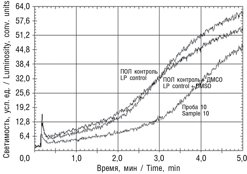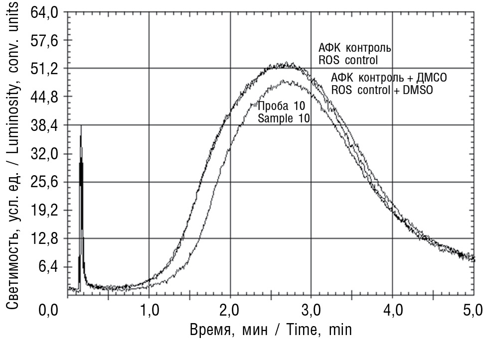 Антиоксидантную активность определяли методом регистрации хемилюминесценции на приборе «ХЛМ-003» (Россия) в системах, моделирующих процессы выработки АФК и перекисного окисления липидов (ПОЛ) [8].