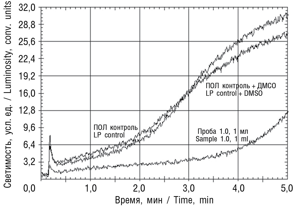 Влияние исследуемых извлечений на ПОЛ изучали в липидах куриного желтка, сходных по составу с липидами крови человека. Липиды получали путем гомогенизирования куриного желтка в фосфатном буфере в соотношении 1 : 5 и последующим разбавлением в 20 раз; отбирали 20 мл. Добавление в систему 1 мл 50 мМ раствора солей Fe2+ вело к инициированию окисления ненасыщенных жирных кислот, что сопровождалось ХЛ. По интенсивности свечения судили о процессах ПОЛ. Окисление липидов инициировалось введением сернокислого железа, катализирующего окисление ненасыщенных жирных кислот, входящих в состав липидов, и образование продуктов перекисного окисления. Уровень спонтанного свечения характеризует интенсивность перекисного окисления липидов до введения катализатора; амплитуда быстрой вспышки отражает скорость окисления ионов Fe2+ и образования АФК и гидроперекисей липидов; длительность латентного периода коррелирует с антиокислительной активностью изучаемого образца. Величина светосуммы свечения определяет способность липидов подвергаться окислению.