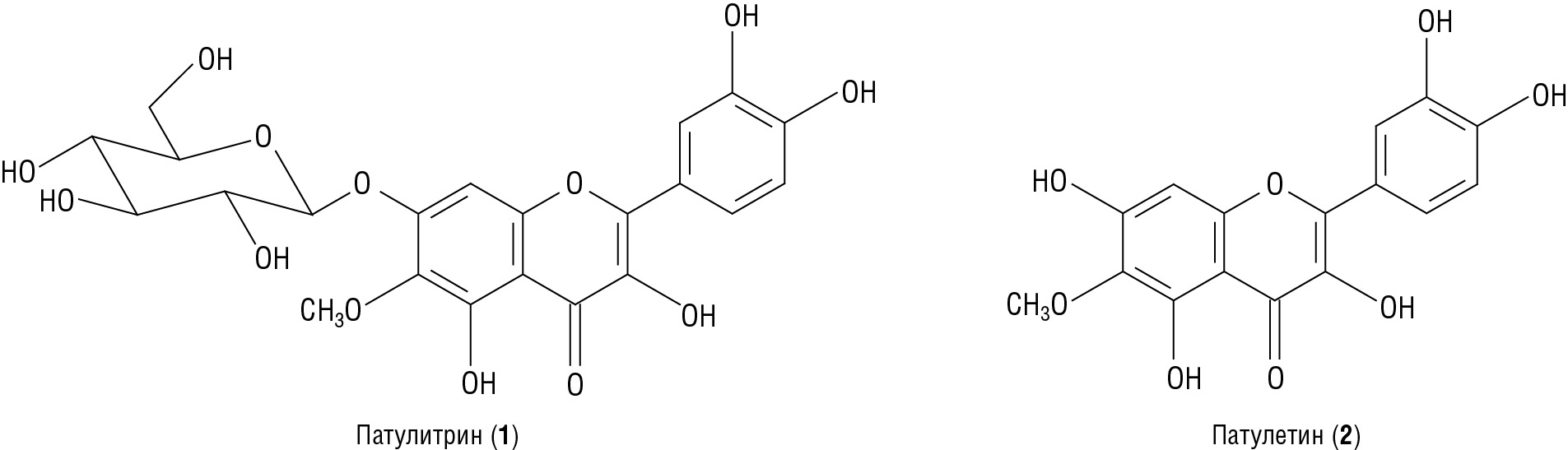 В результате хроматографических исследований нами были выделены флавоноиды, идентифицированные как патулитрин (7-О-β-D-глюкопиранозид 3,5,7,3ʹ,4ʹ-пентагидрокси-6-метоксифлавона) и его агликон — патулетин (3,5,7,3ʹ,4ʹ-пентагидрокси-6-метоксифлавон) (рис. 1).