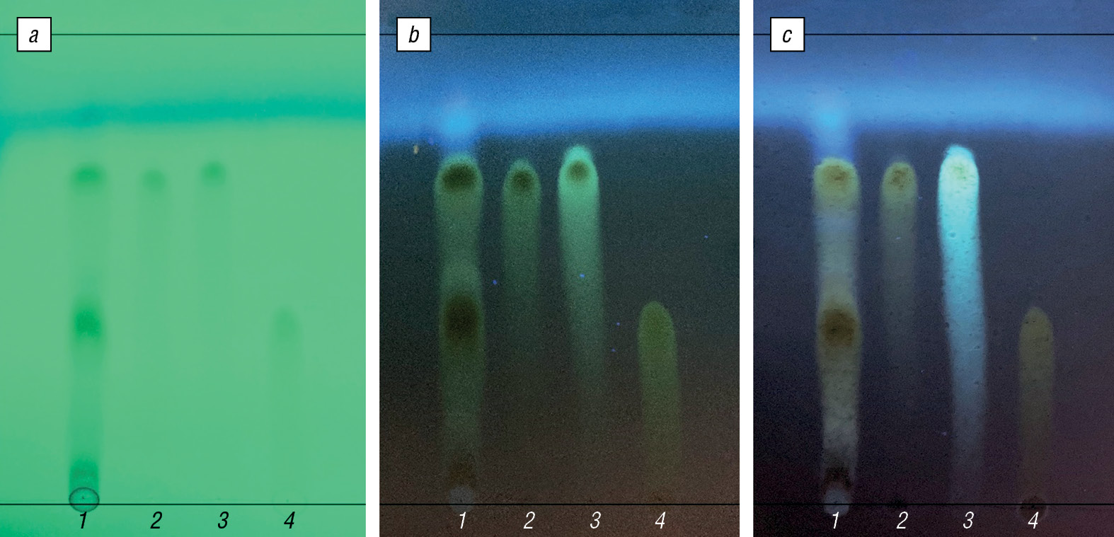 Рис. 2. Хроматограмма анализа водно-спиртового извлечения цветков бархатцев отклоненных в системе растворителей хлороформ – этанол – вода (25 : 18 : 2). Детекция в УФ-свете при длине волны 254 нм (a); 366 нм (b); 366 нм после обработки спиртовым раствором AlCl3 (c). 1 — настойка цветков бархатцев отклоненных; 2 — патулетин; 3 — кверцетин; 4 — патулитрин / Fig. 2. The chromatogram of the analysis of water-alcohol extraction of Tagetes patula L. flowers in the system of solvents chloroform – ethanol – water (25:18:2). Detection in UV light at the wavelength of 254 nm (a); 366 nm (b); 366 nm in the presence of alcohol solution of AlCl3 (c). 1 — tincture of Tagetes patula L. flowers; 2 — patuletin; 3 — quercetin; 4 — patulitrin