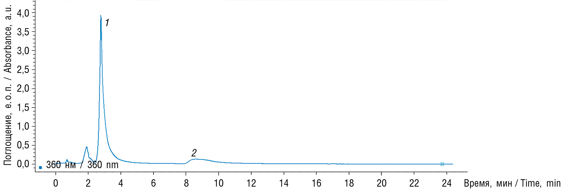 Рис. 3. Высокоэффективная жидкостная хроматограмма извлечения из цветков бархатцев отклоненных: 1 — патулитрин; 2 — патулетин / Fig. 3. HPLC chromatogram of water-alcohol extraction from Tagetes patula L. flowers: 1 — patulitrin; 2 — patuletin