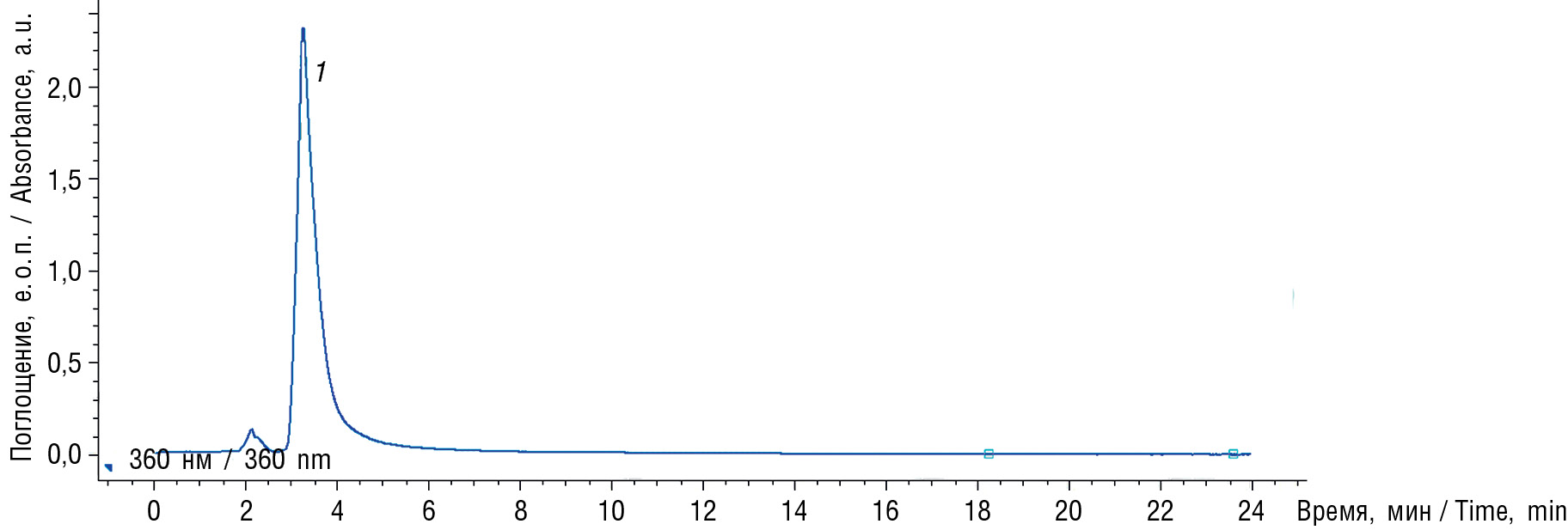 Проводят УФ-детектирование при длине волны 360 нм, диапазон чувствительности 0,5. Проводят не менее 3 параллельных определений.
